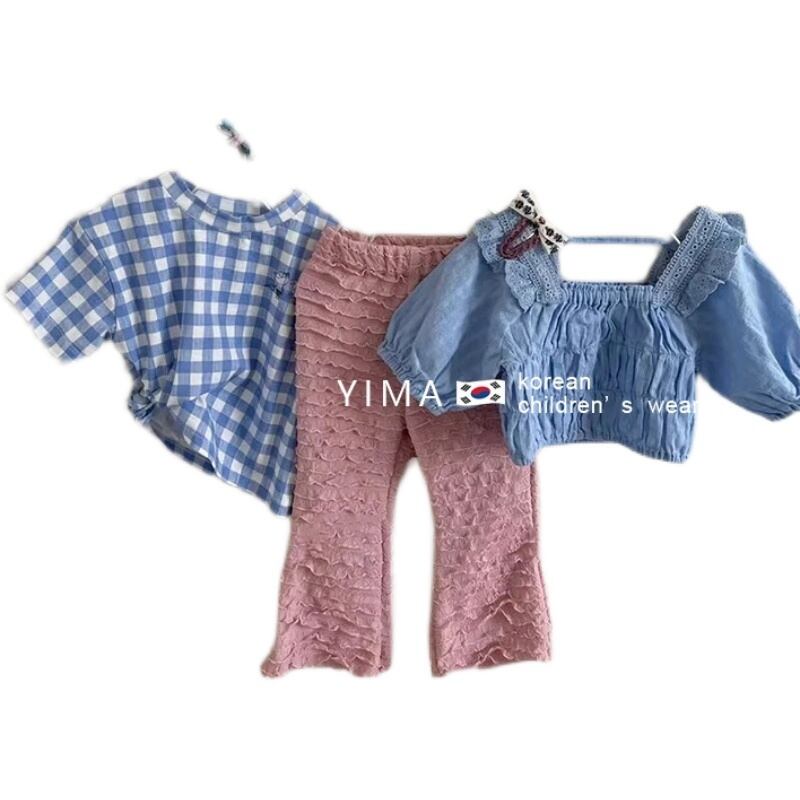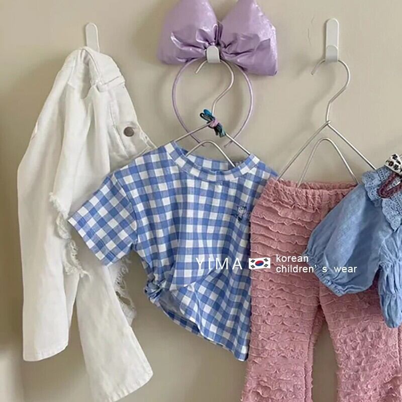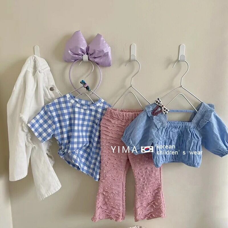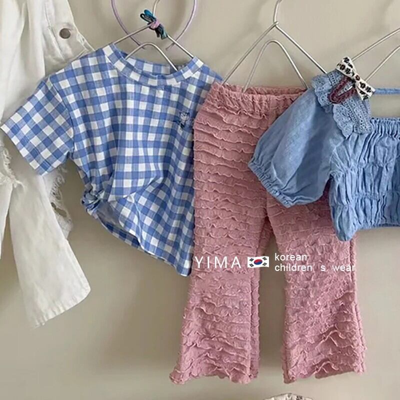 色:ブルーのスクエアネックトップ,ピンクのパンツ,ブルーチェック柄トップ,白いズボン