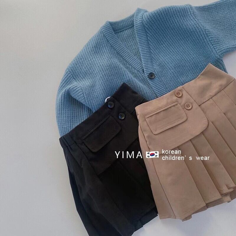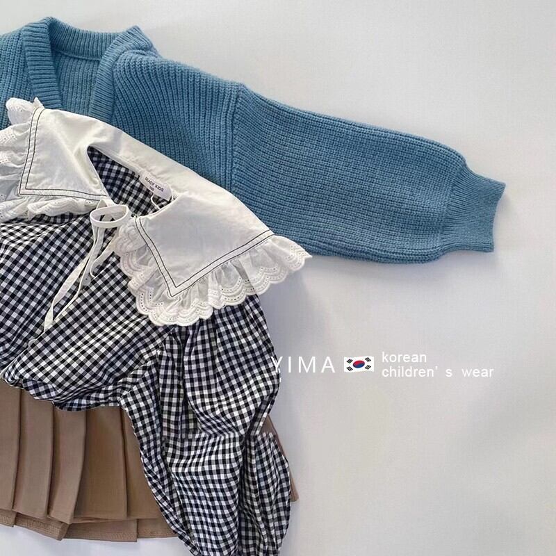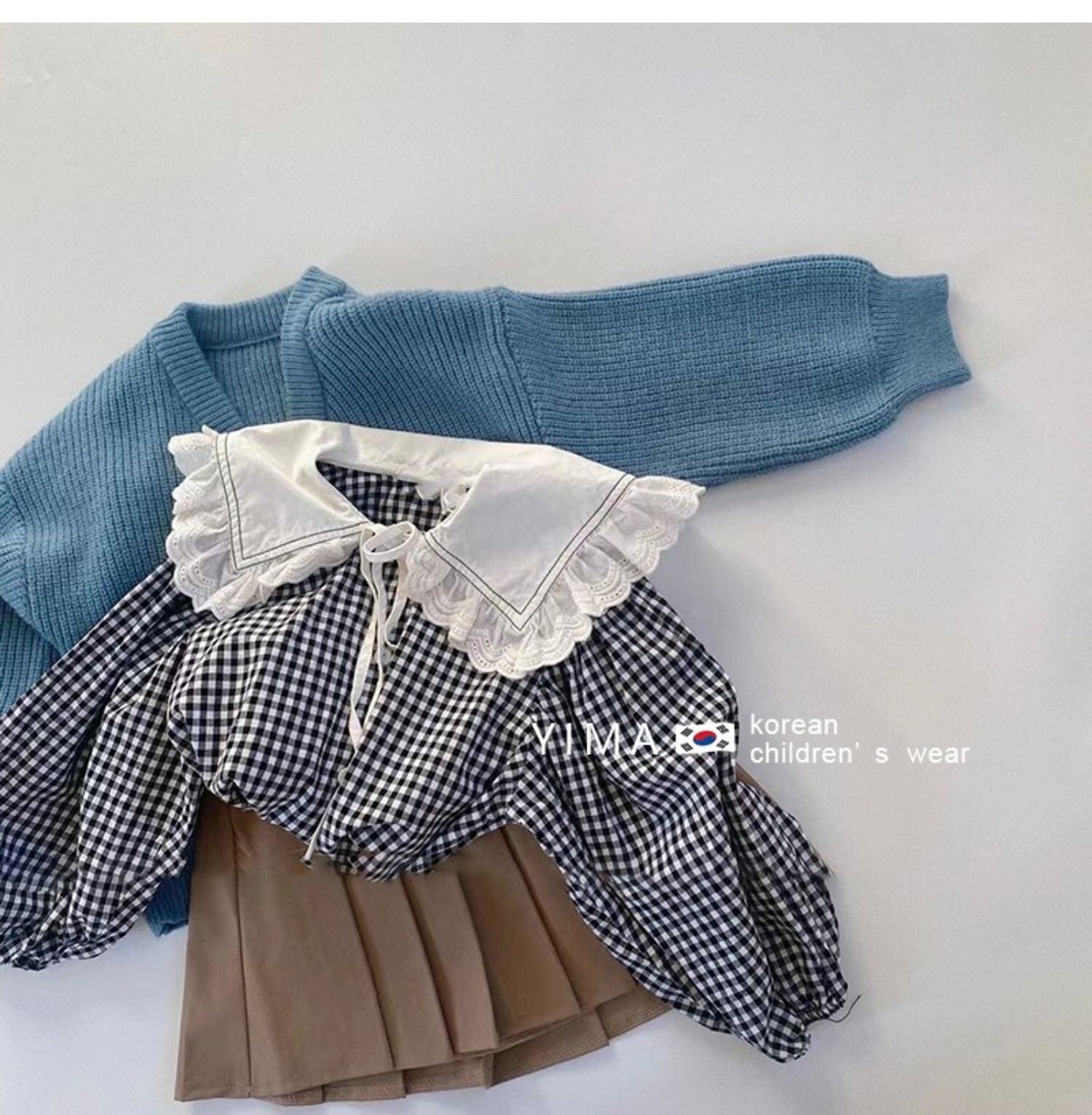 色:ブルーニットカーディガン,黒と白の格子縞のシャツ,白のシャツ,黒スカート,カーキ色のスカート