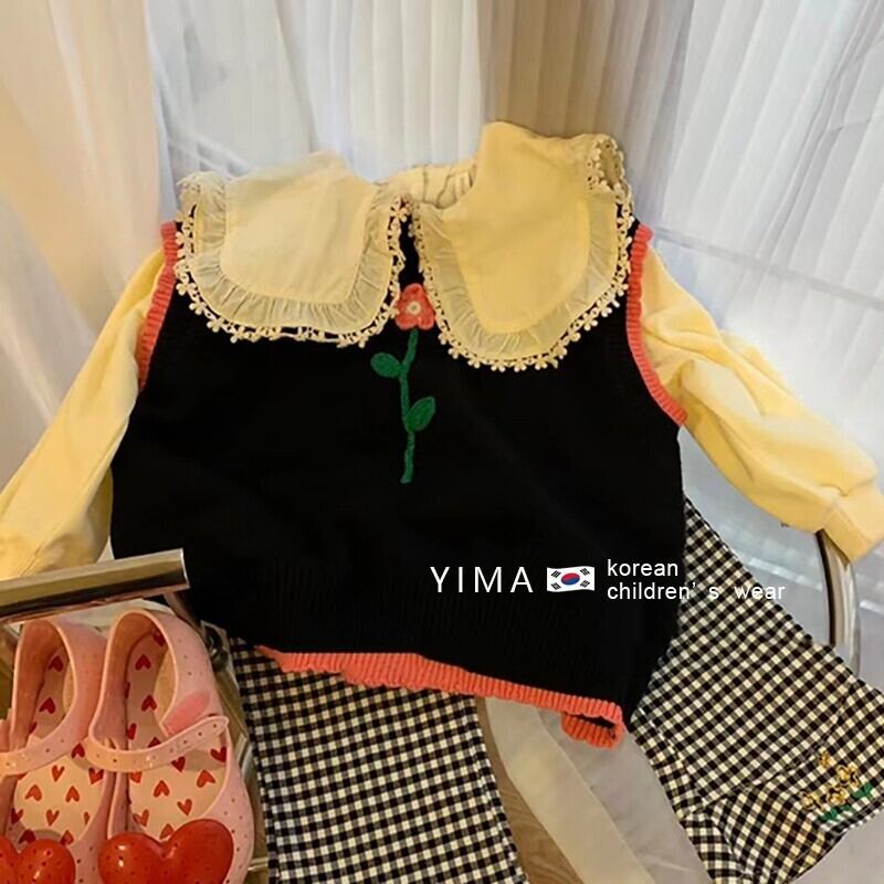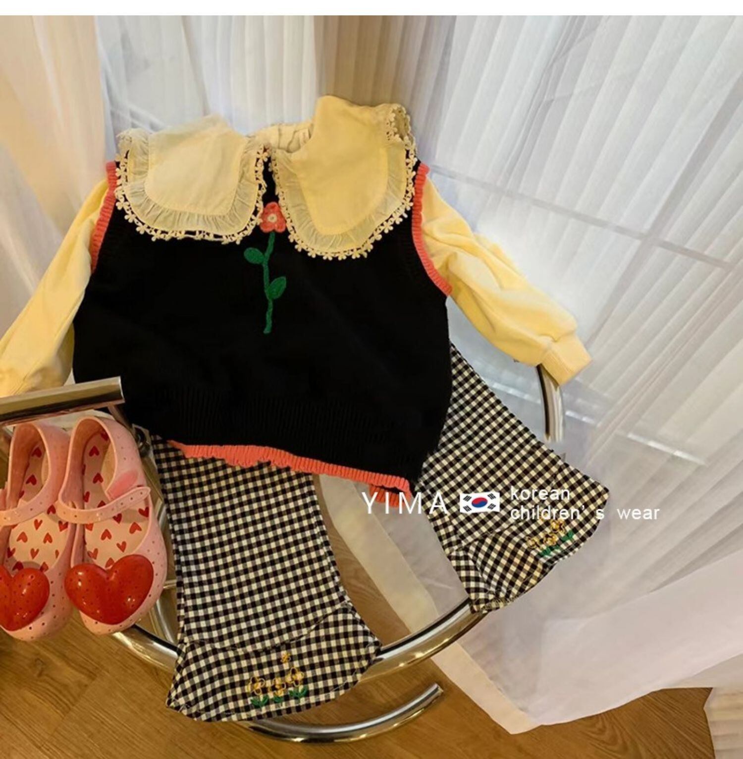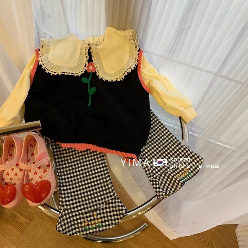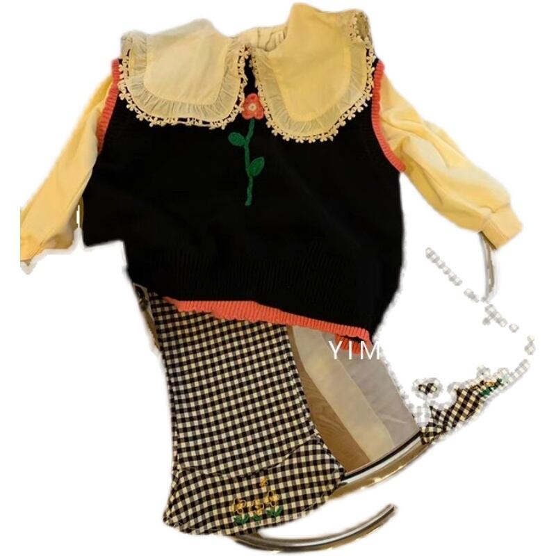 色:黒のニットベスト,黄色の長袖トップ,チェック柄パンツ