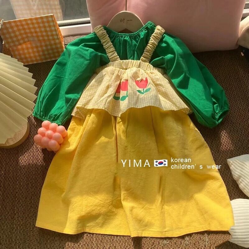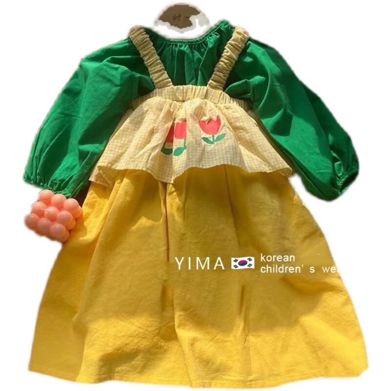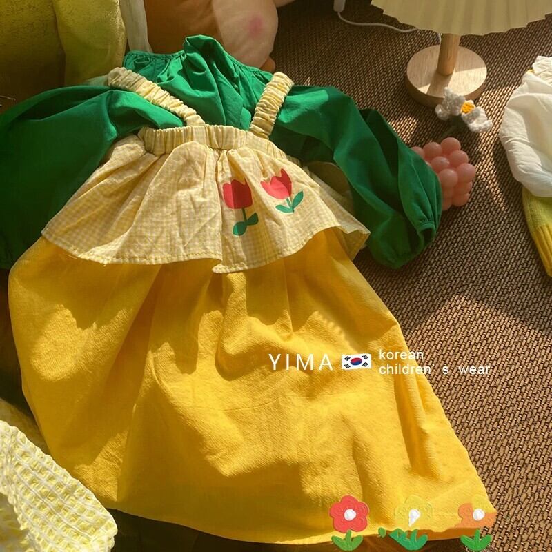 色:マンゴーイエローサスペンダースカート,緑の長袖
