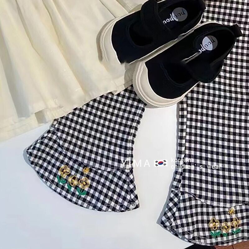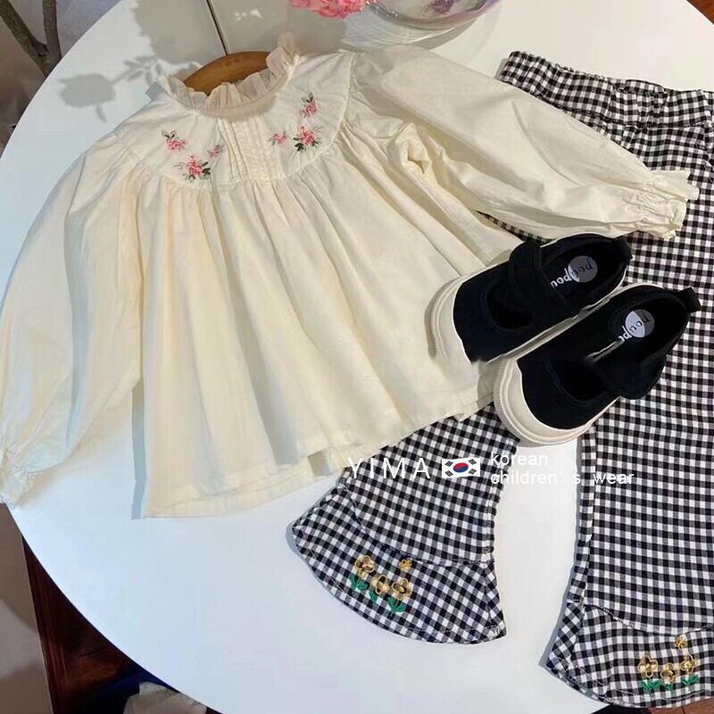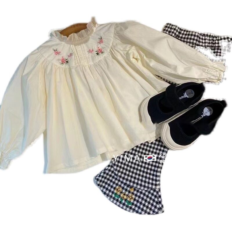 色:オフホワイトの刺繡シャツ,黒のチェック柄パンツ