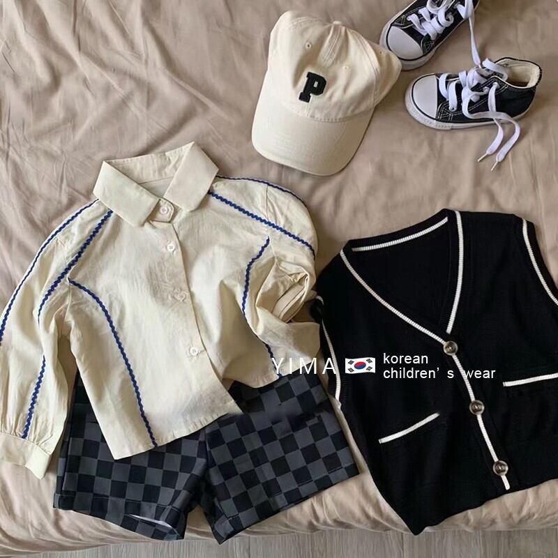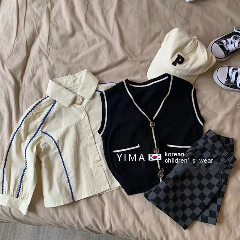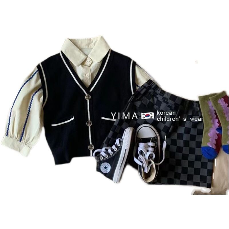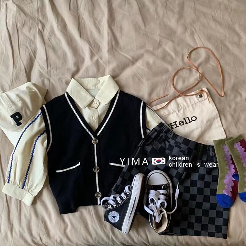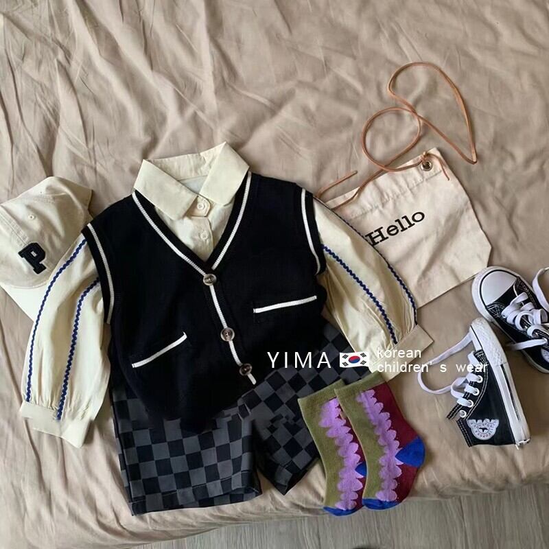 色:黒のニットベスト,ベージュの長袖シャツ,ブラックチェック柄ショーツ