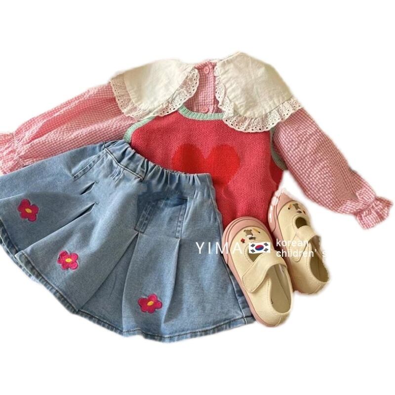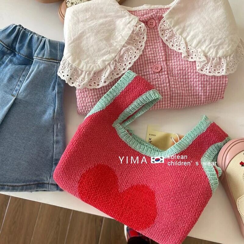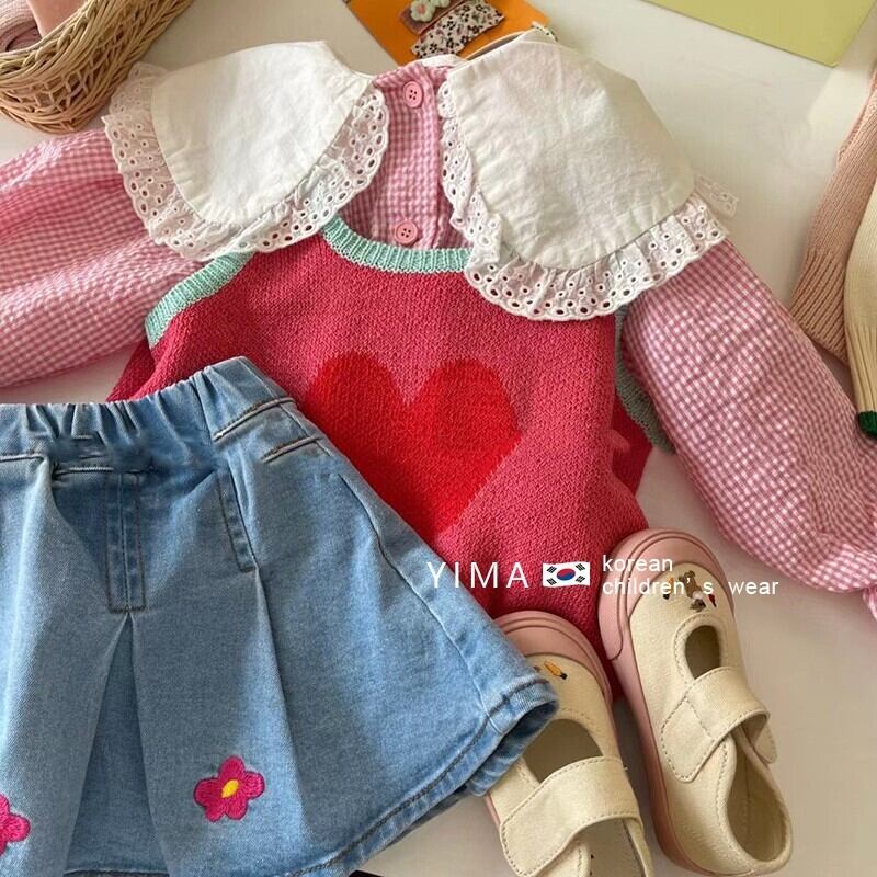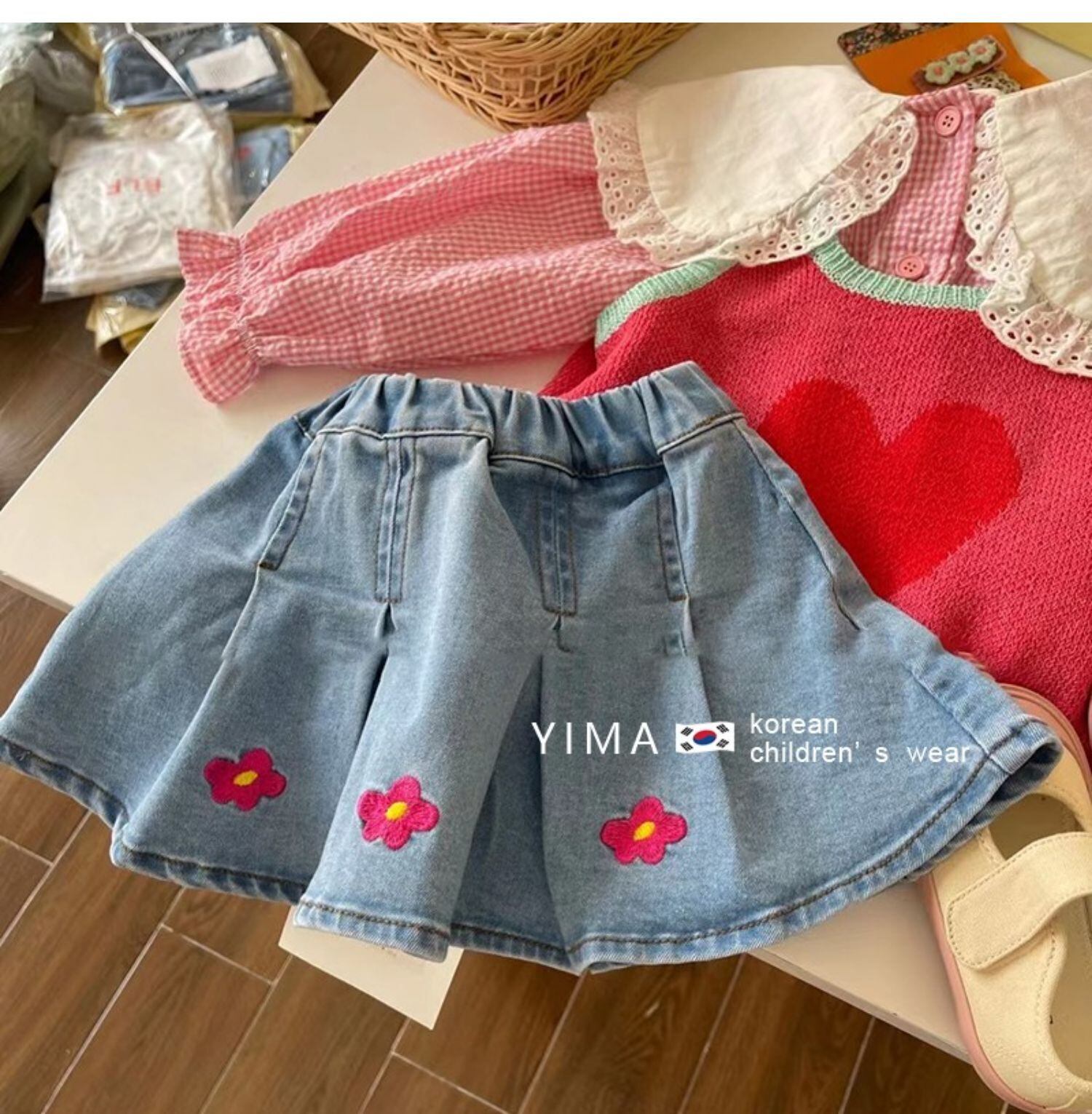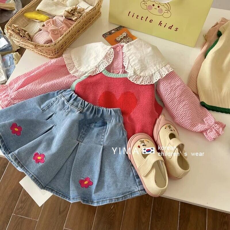 色:デニムスカート,スイカ赤ベスト,ピンクのシャツ