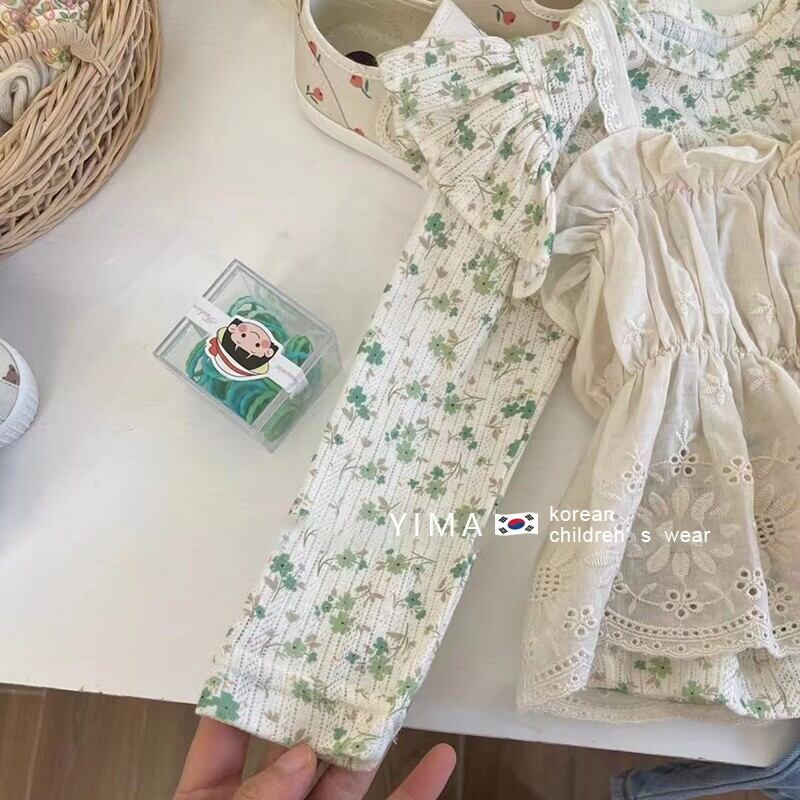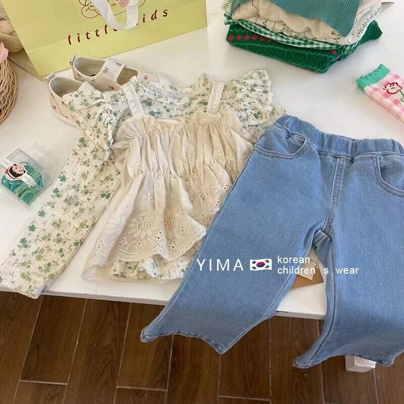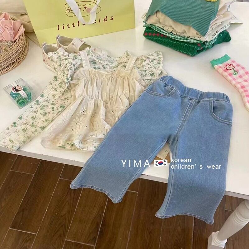 色:アプリコットスリング,グリーンフローラルロングスリーブトップ,ブルージーンズ