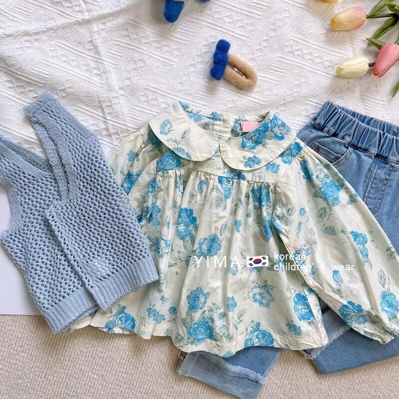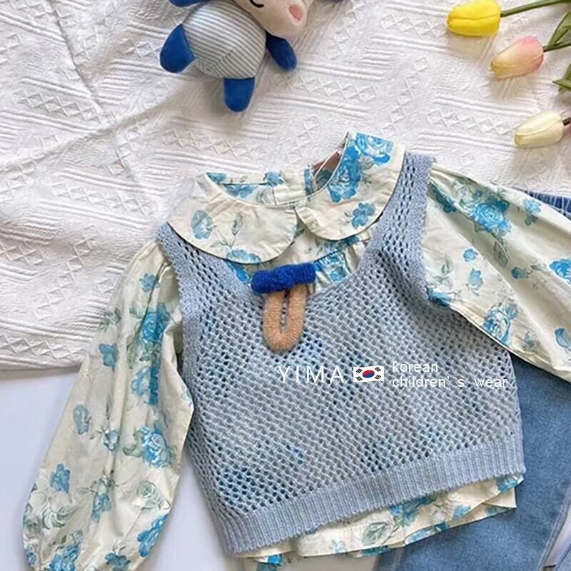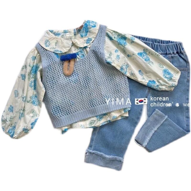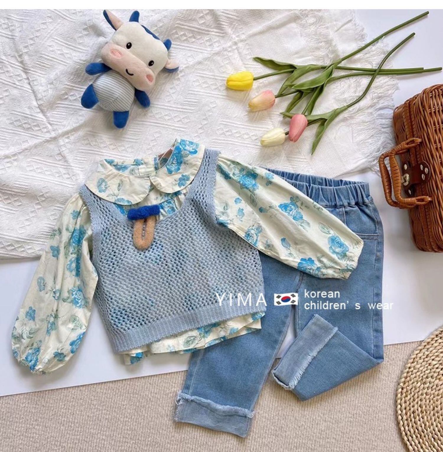 色:ブルーニットベスト,ブルーフローラルシャツ,ブルージーンズ