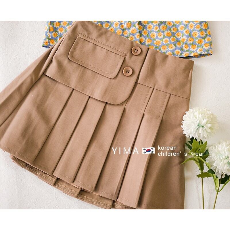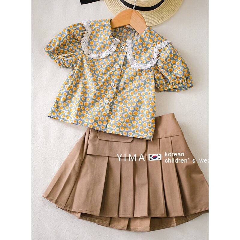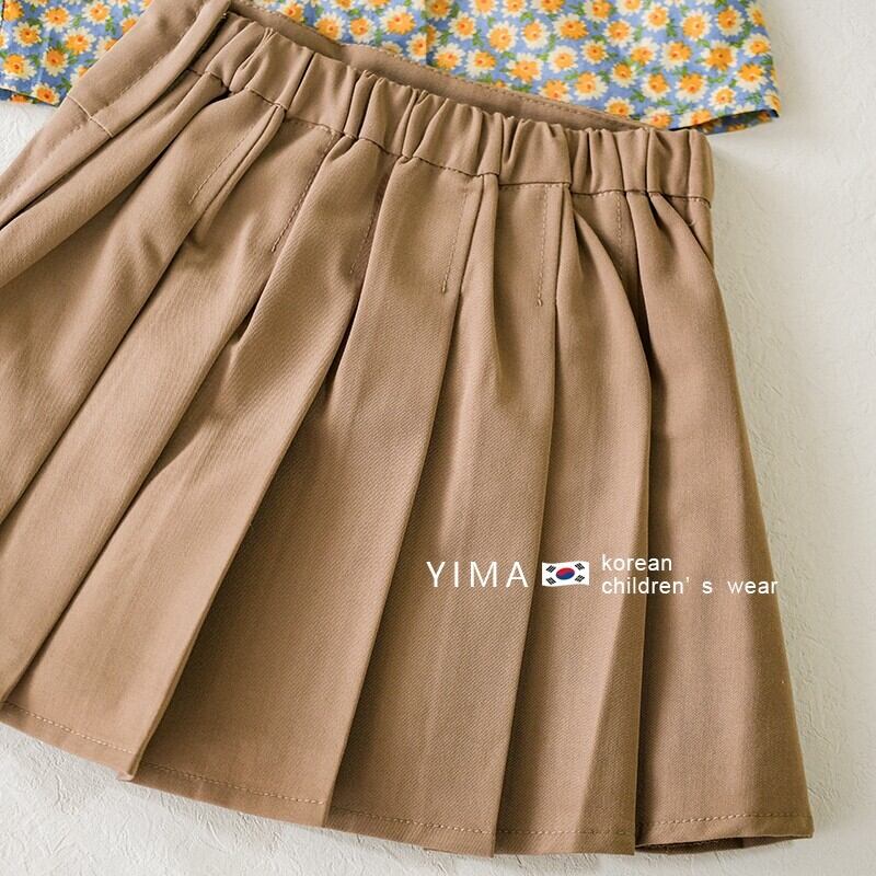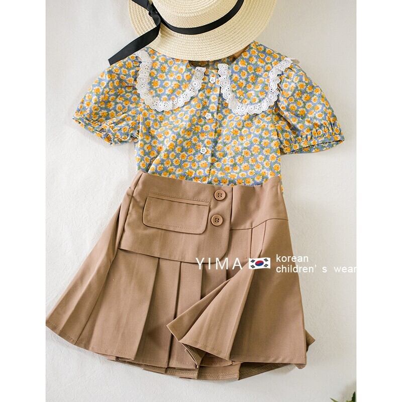 色:黄色い花柄のシャツ,カーキ色のスカート