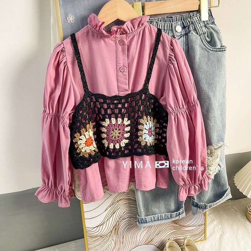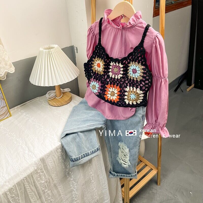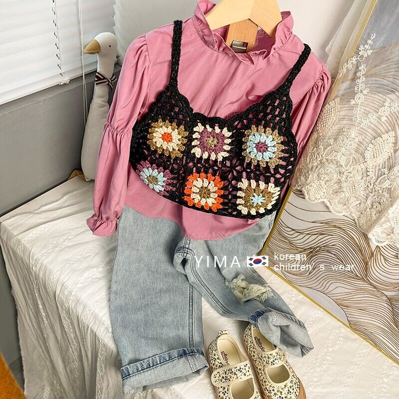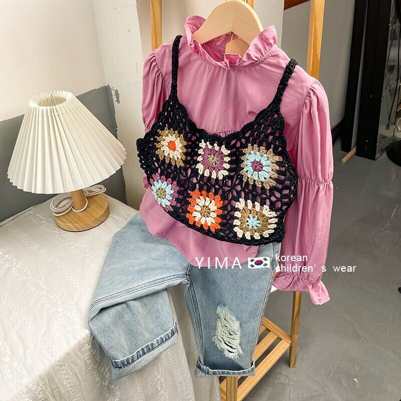 色:黒のニットベスト,ピンクの長袖シャツ,ブルージーンズ