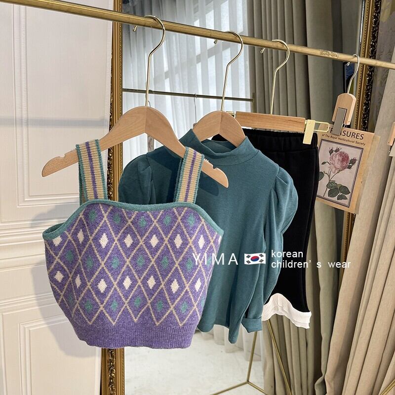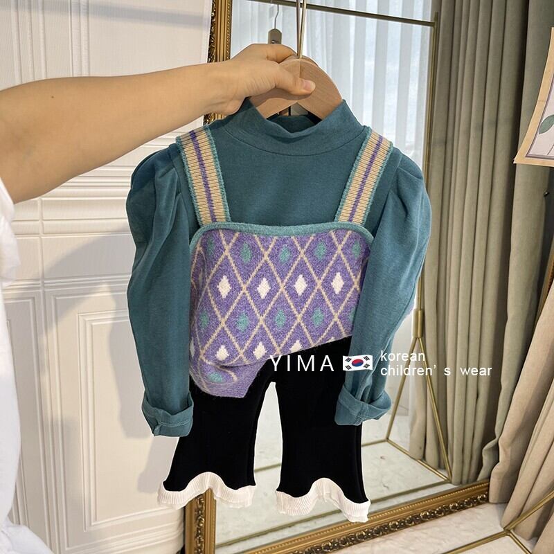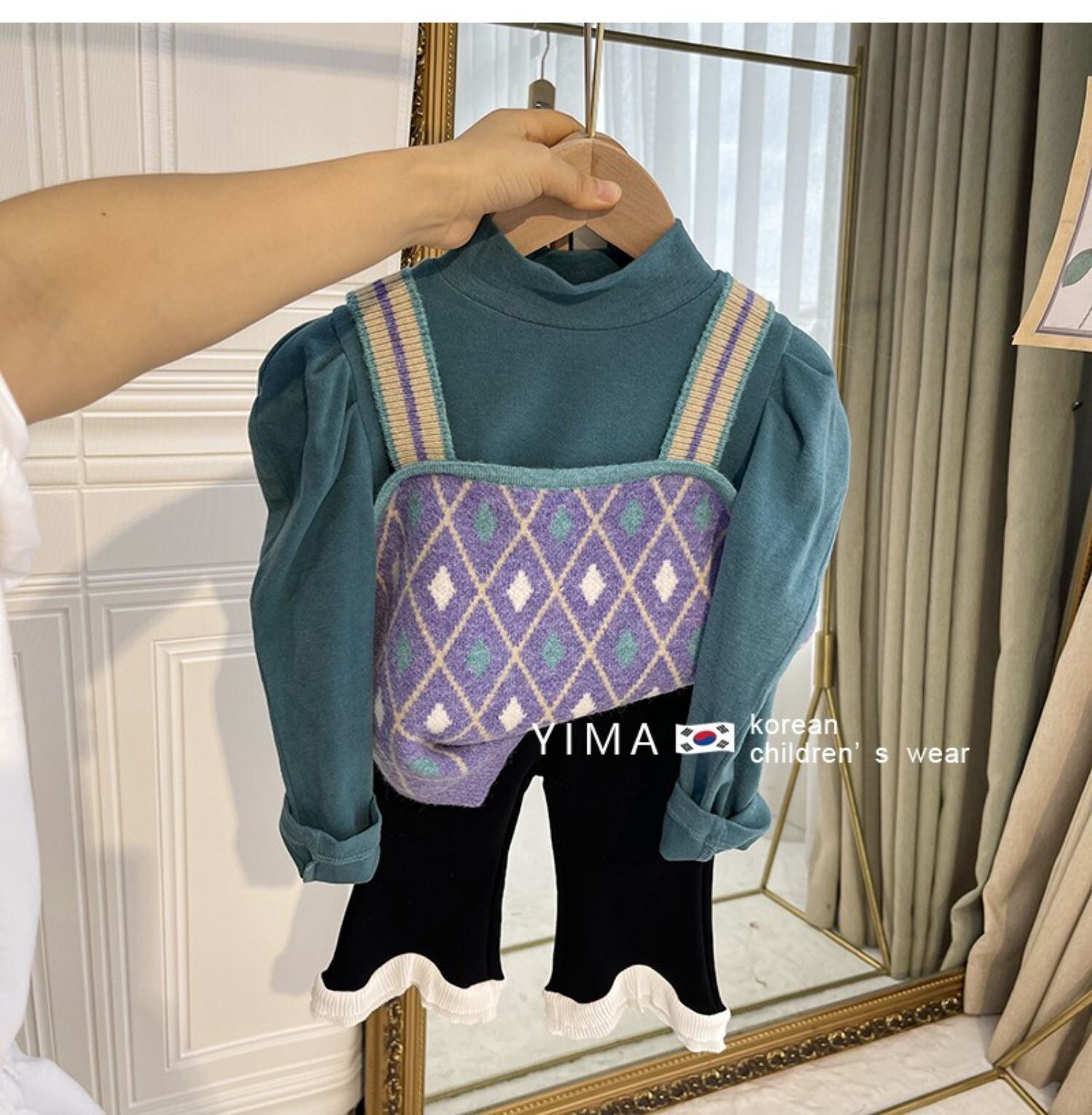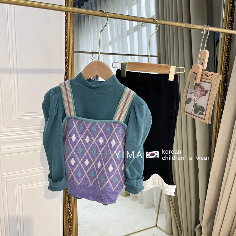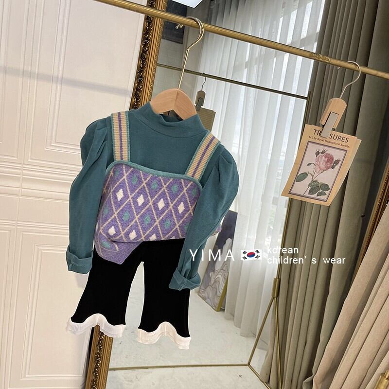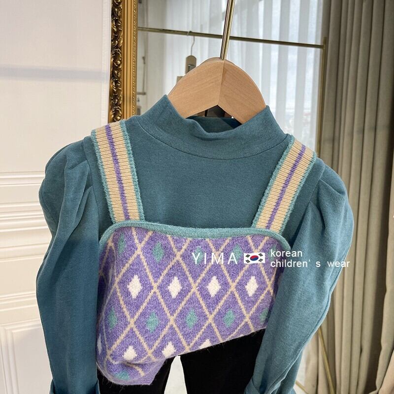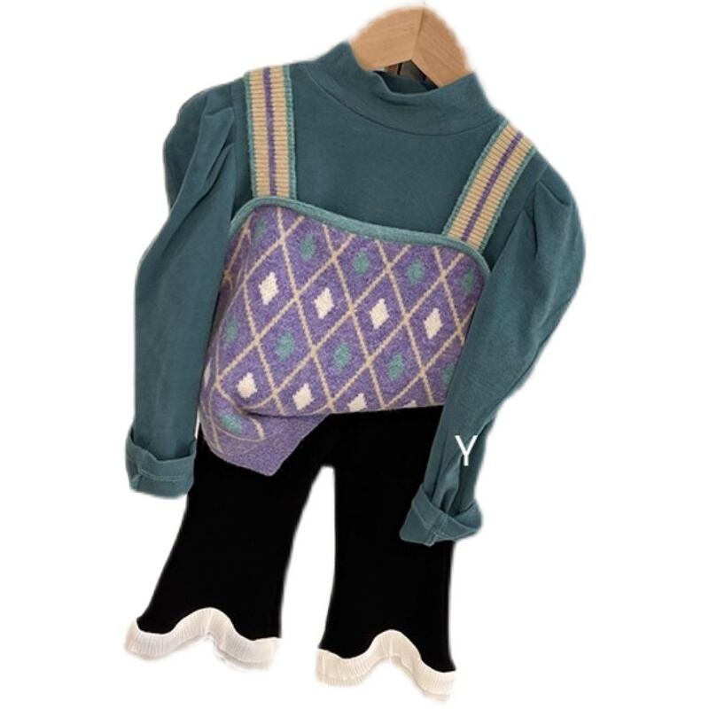 色:パープルニットベスト,ブルーパフスリーブボトミングシャツ,黒のレースパンツ