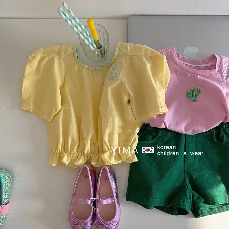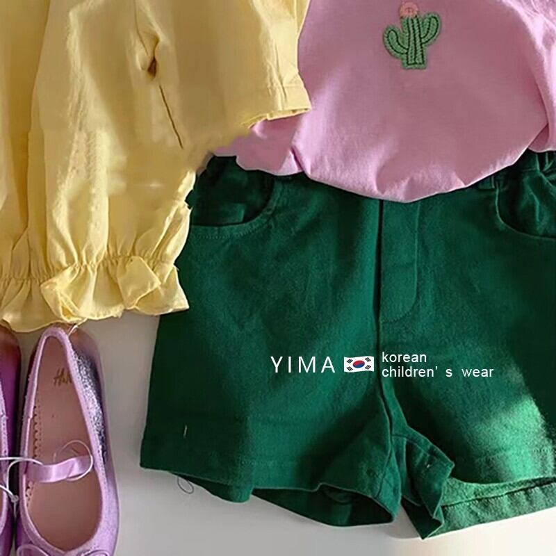 色:黄色のシャツ,ピンクトップ,グリーンショートパンツ
