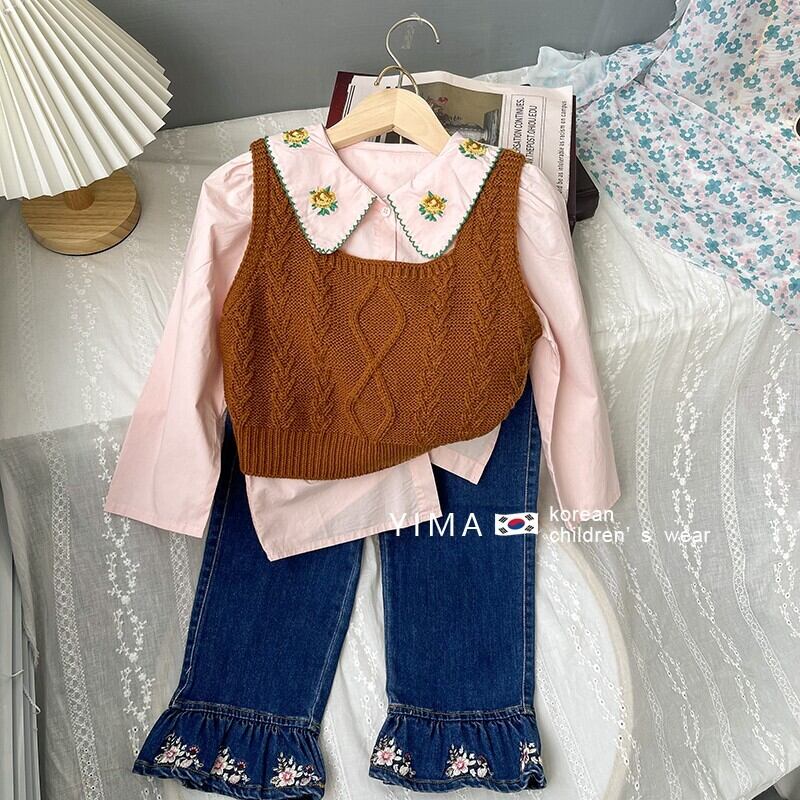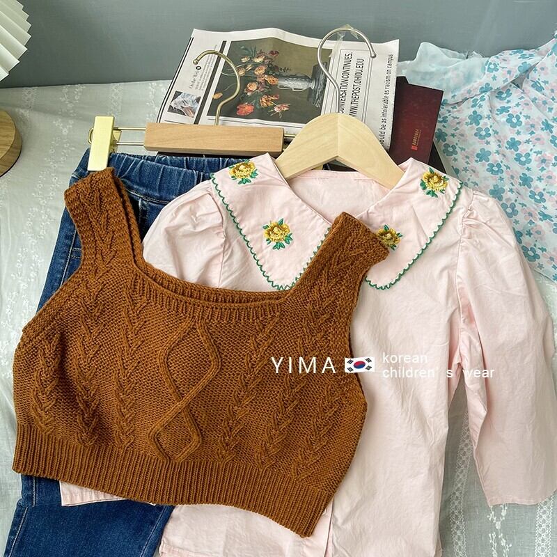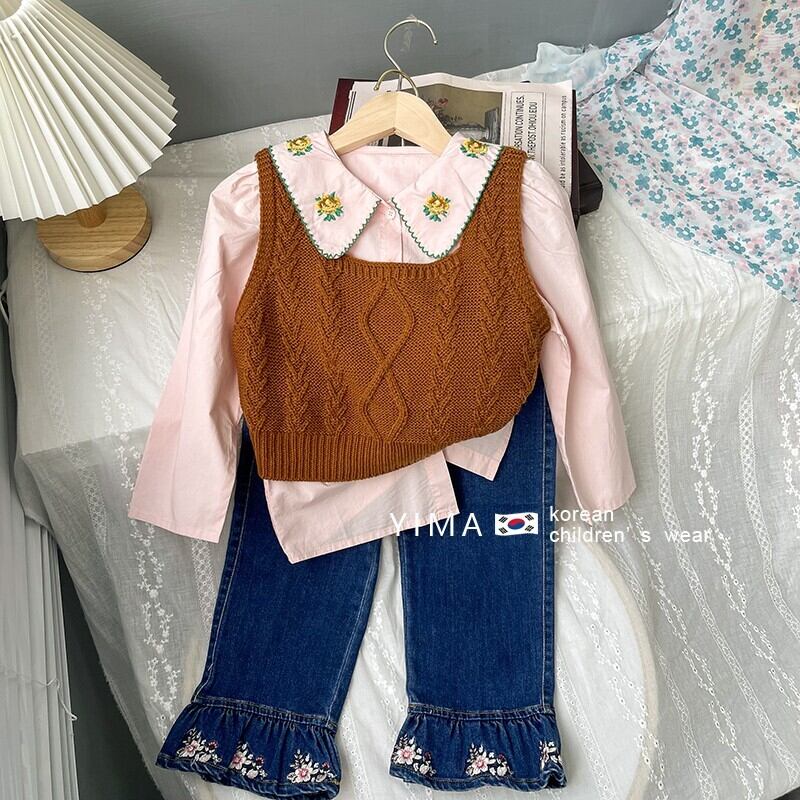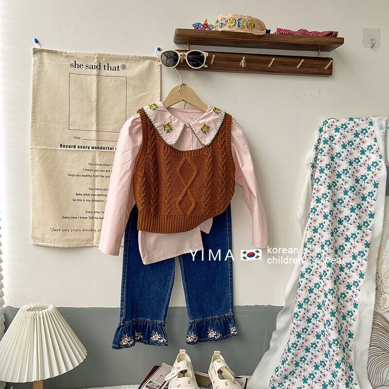 色:ブラウンベスト,ピンクのシャツ,青パンツ