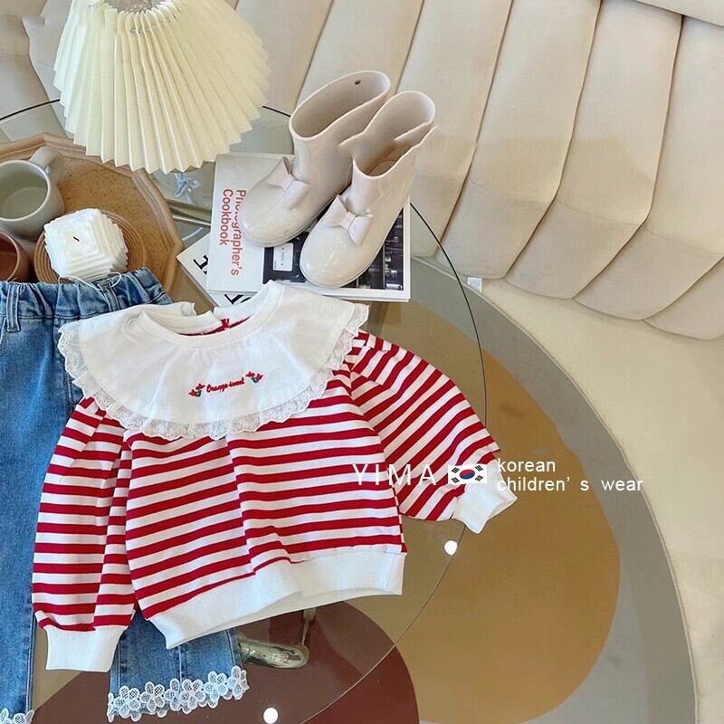 色:レッドストライプトップ,ブルージーンズ