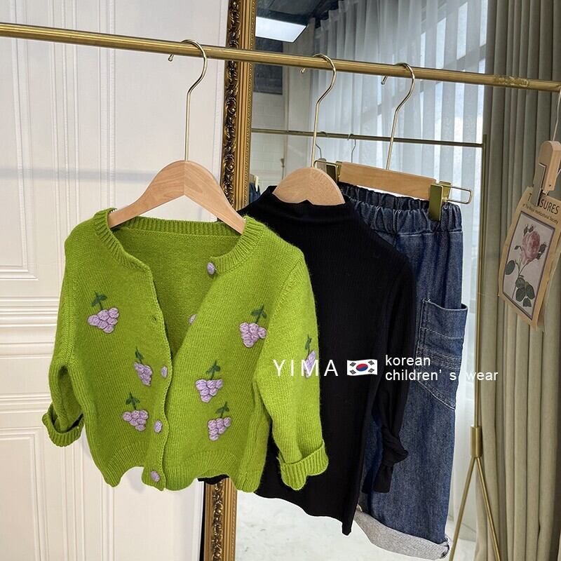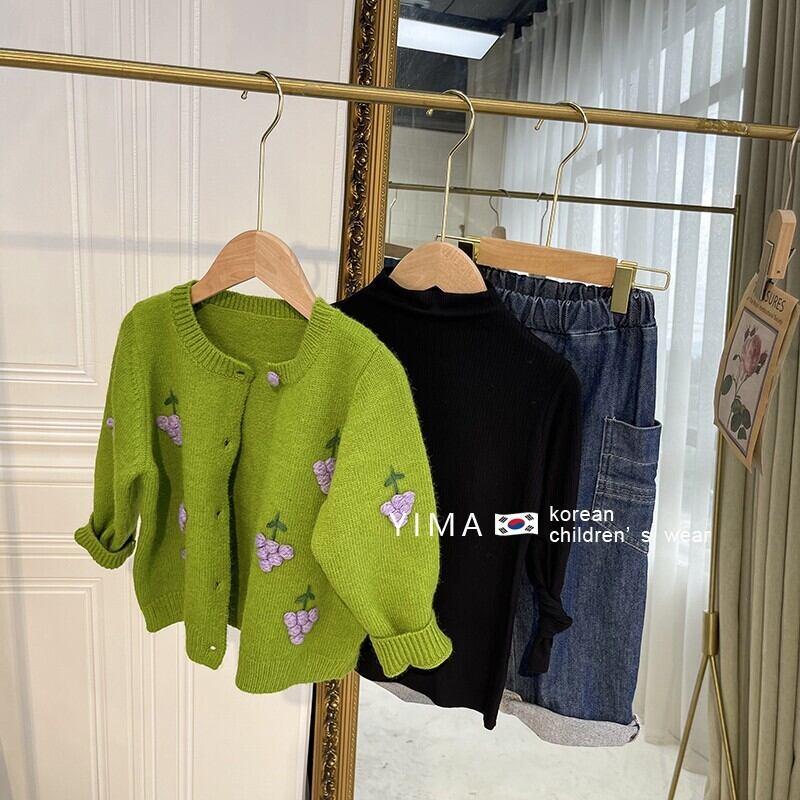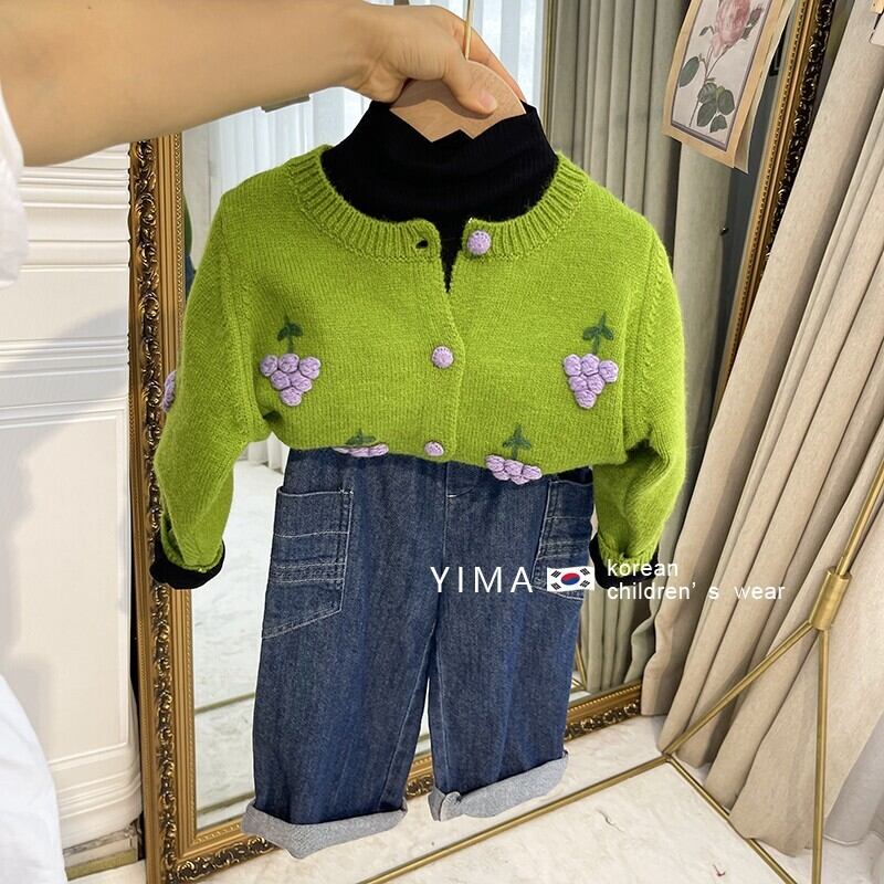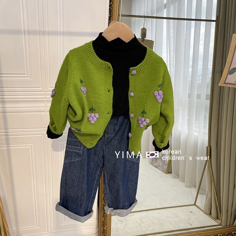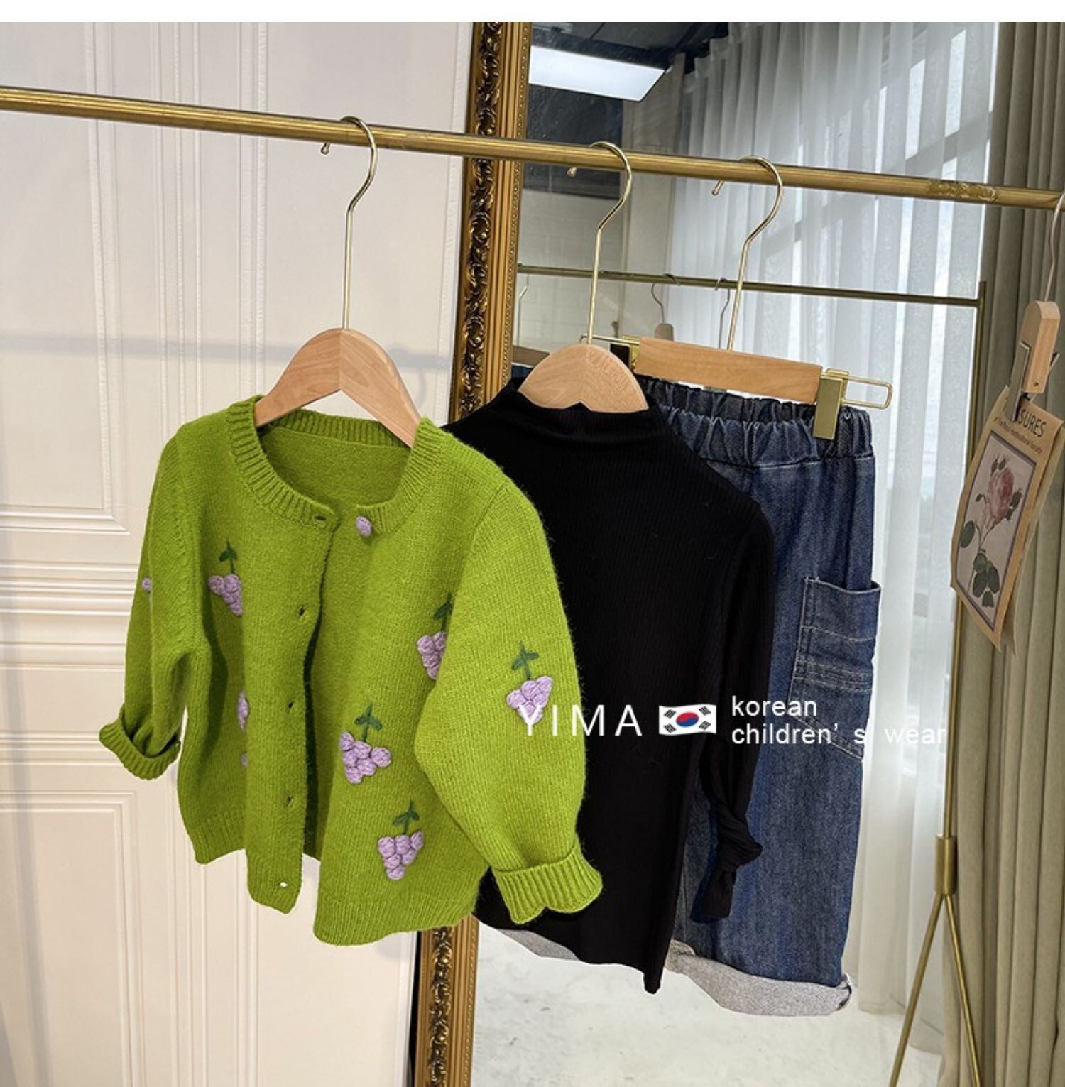 色:黒底シャツ,青パンツ,緑のブドウのセーター,紫ブドウのセーター