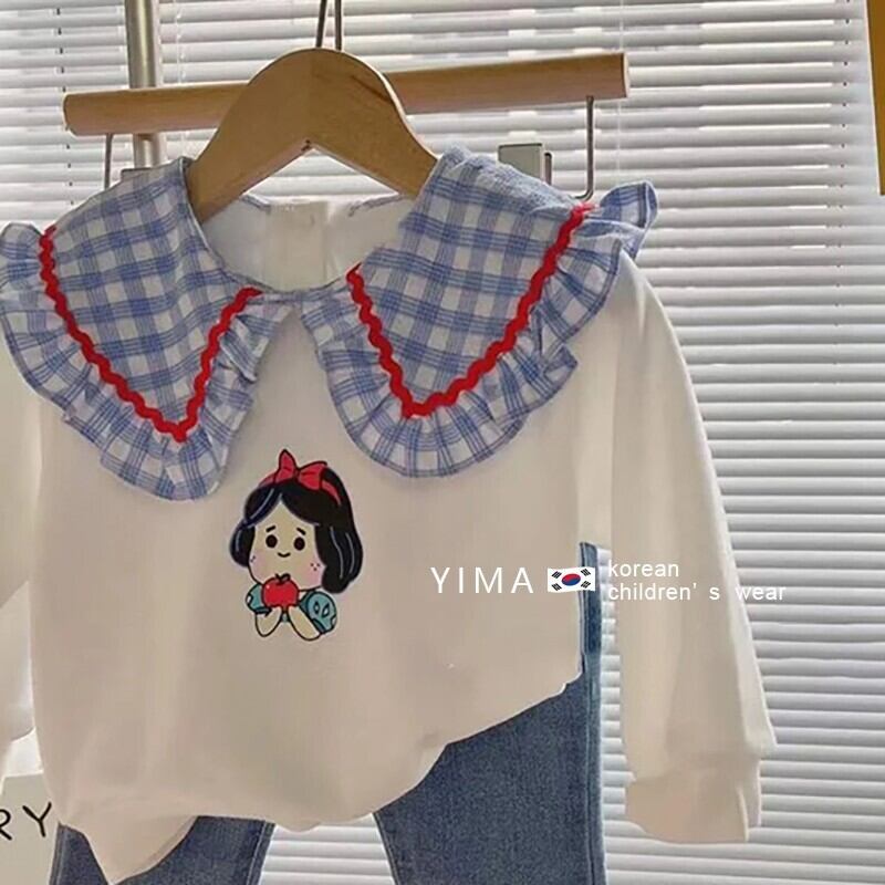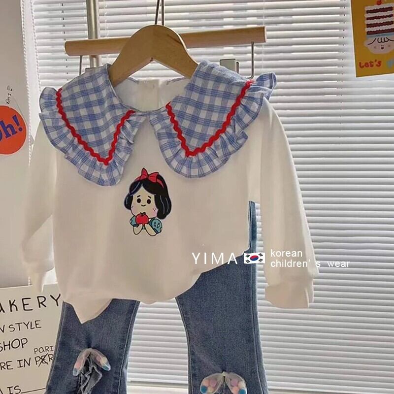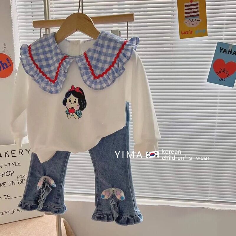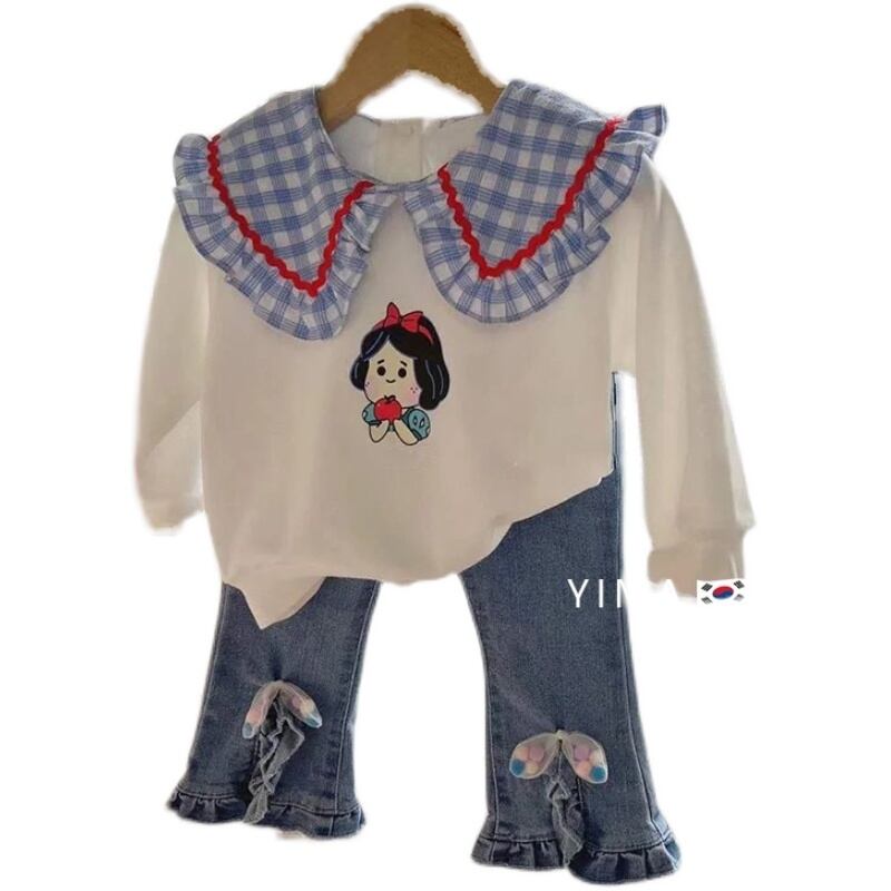 色:格子縞の人形の襟のトップ,ブルージーンズ
