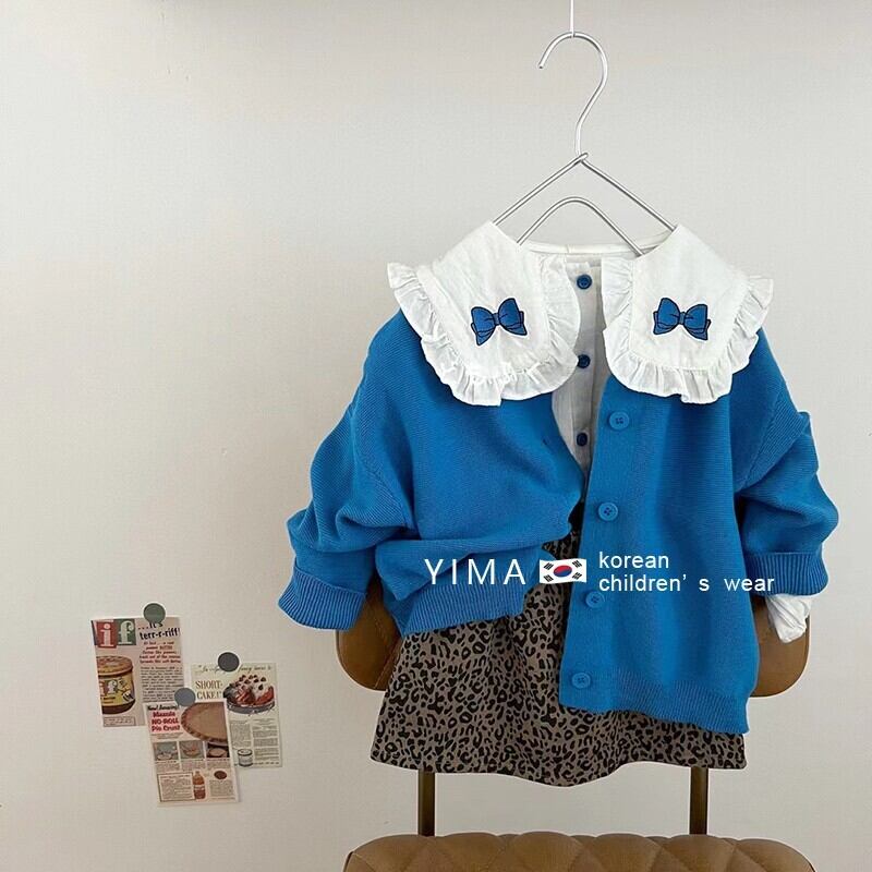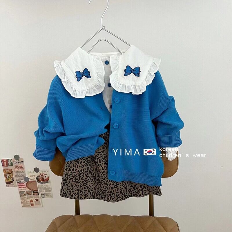 色:青いセーター,白い人形の襟のシャツ,Ceeカラーヒョウ柄スカート