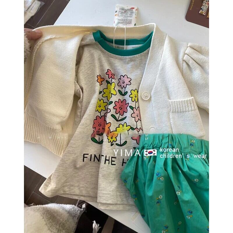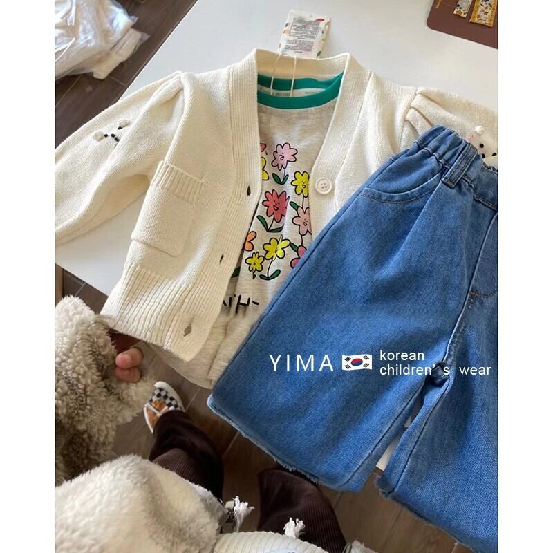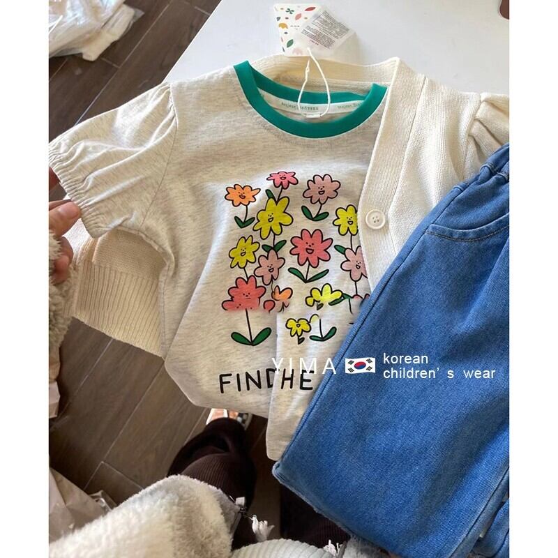 色:ブルージーンズ,グレーの小さなフラワートップ