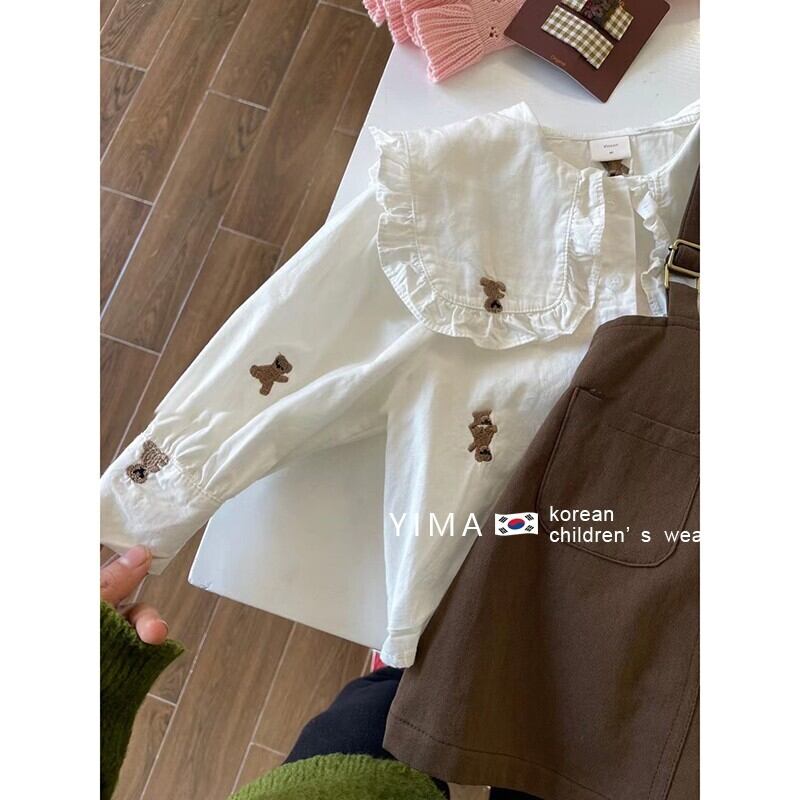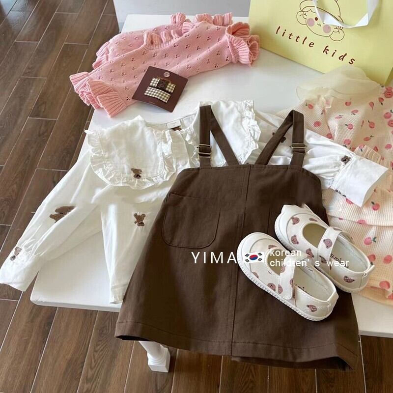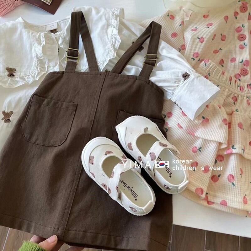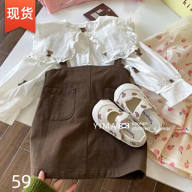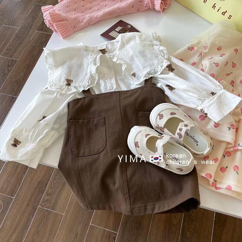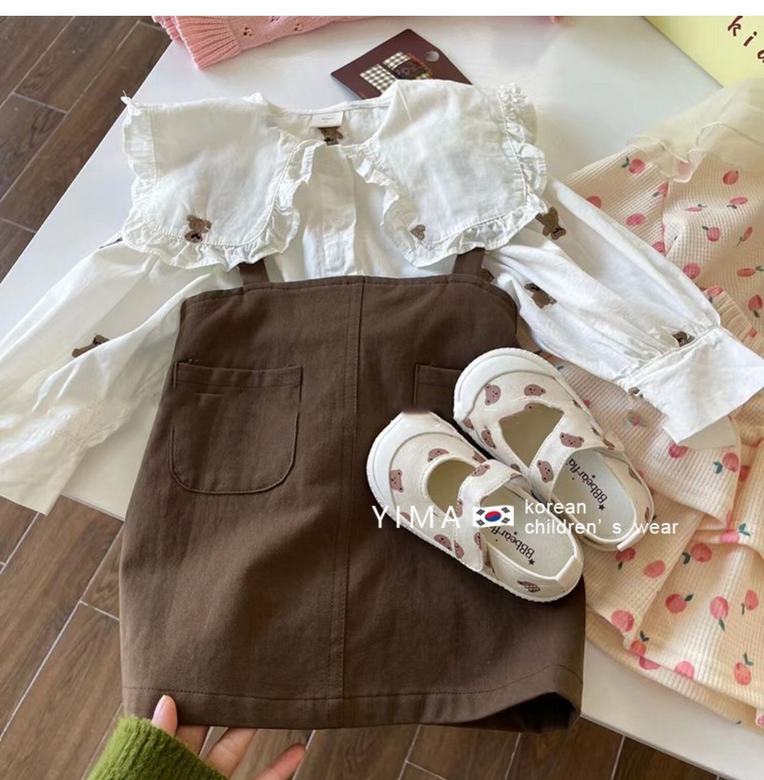 色:ホワイトベアシャツ,ダークブラウンのサスペンダースカート