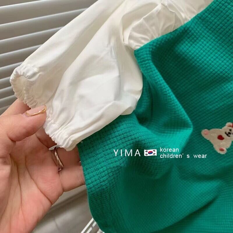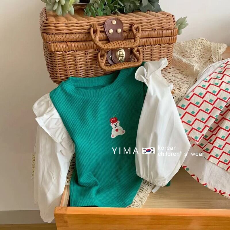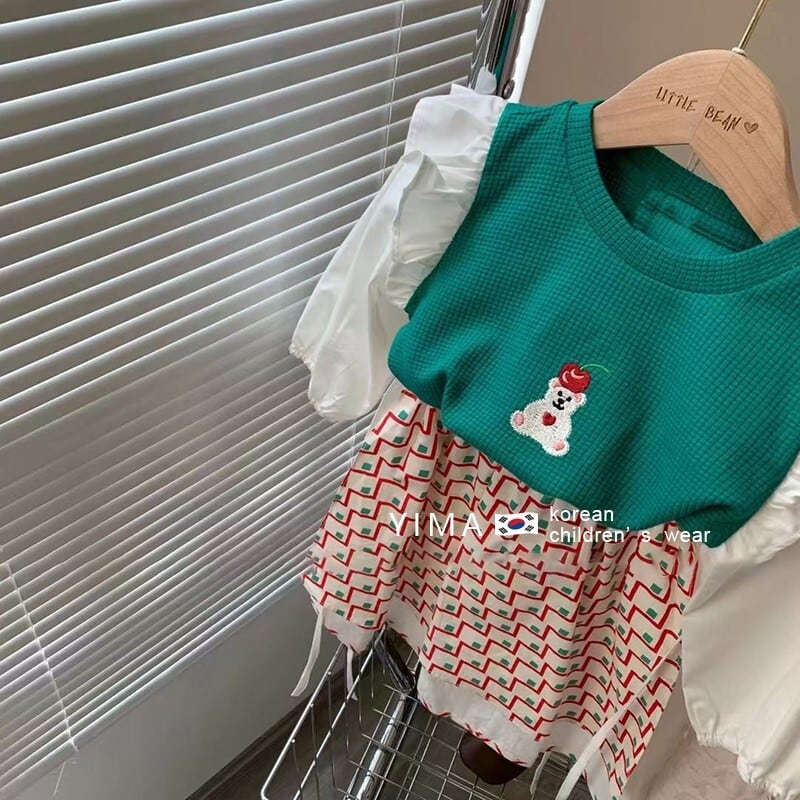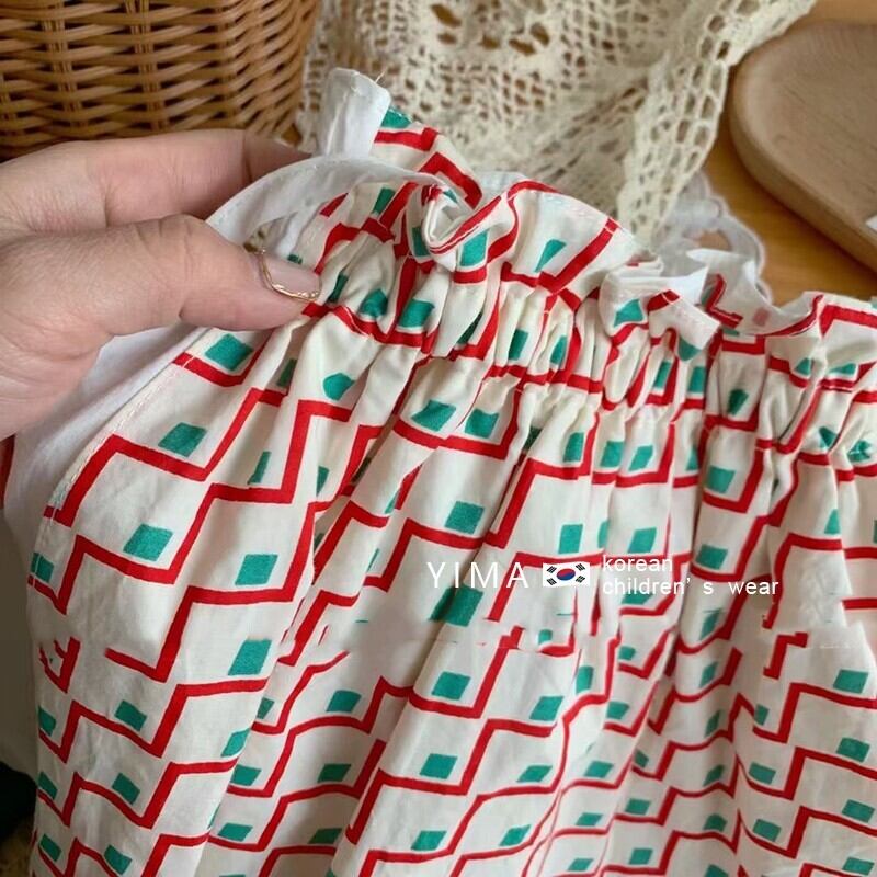 色:緑と白のフリルトップ,赤い格子縞のスカート