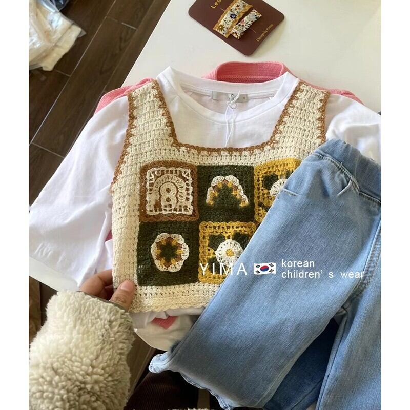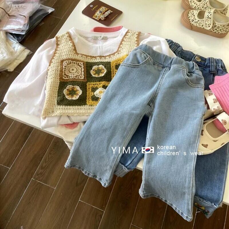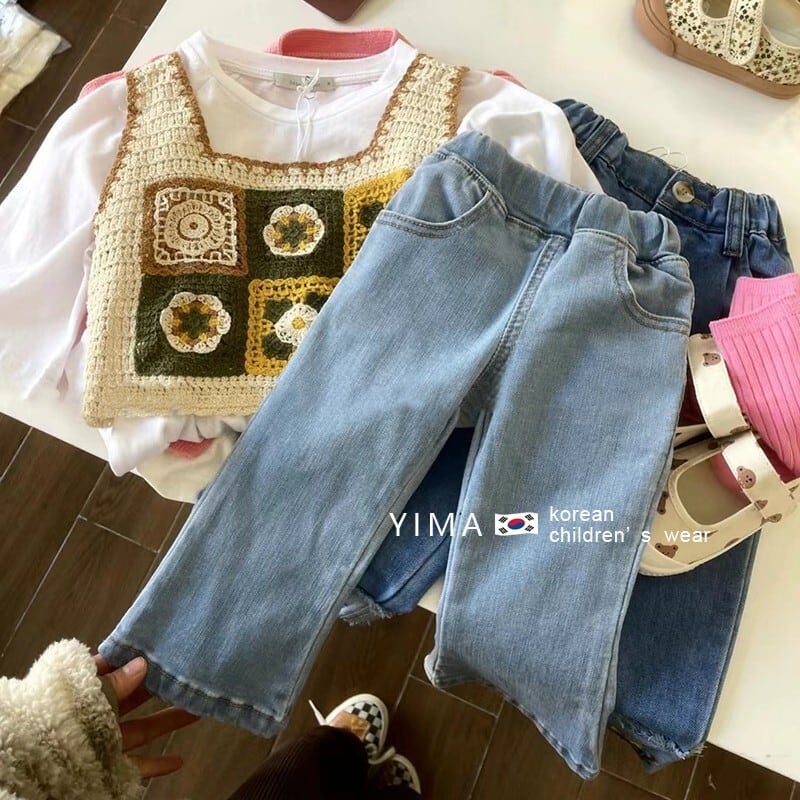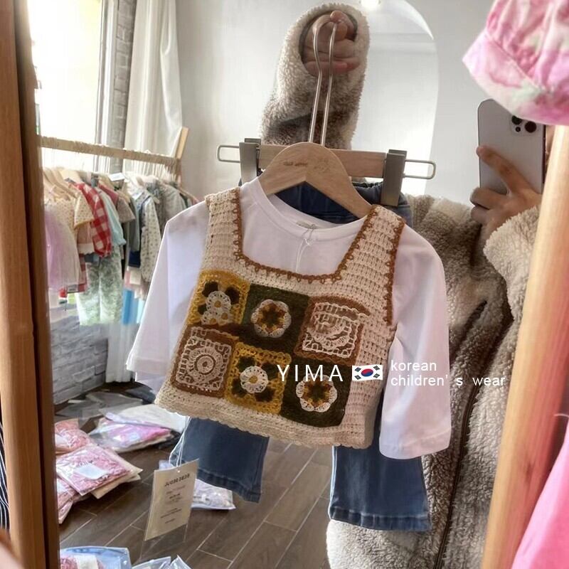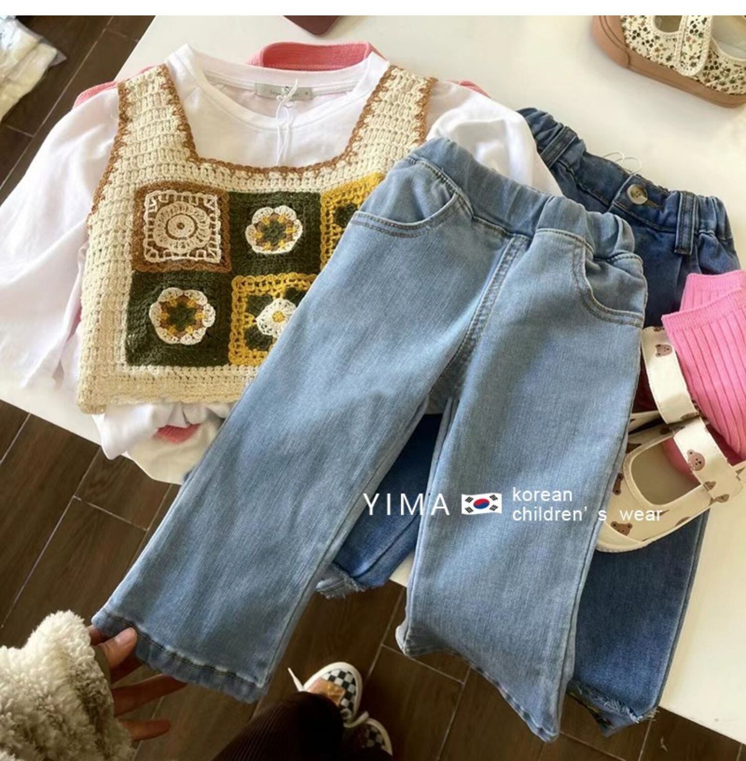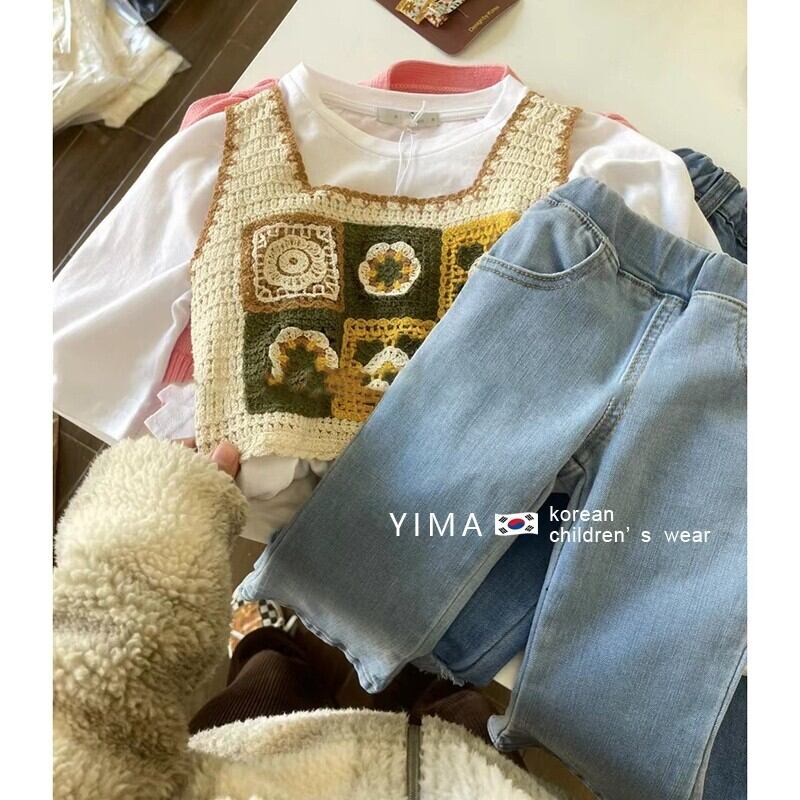 色:ライトブルージーンズ,ホワイトロングスリーブトップ,ベージュのニットベスト