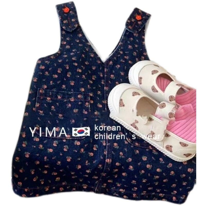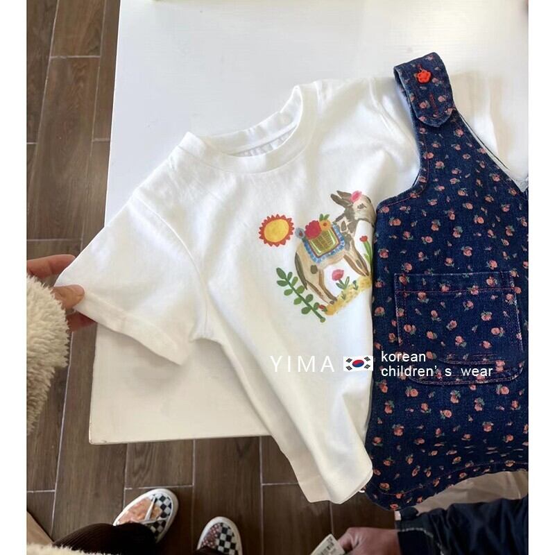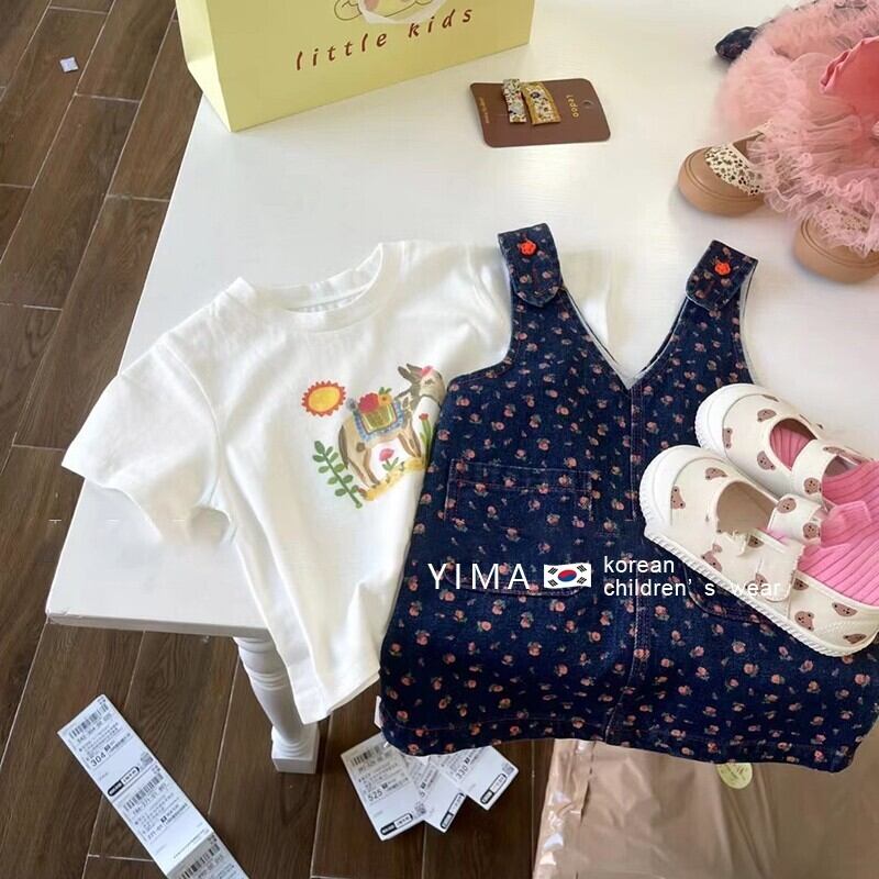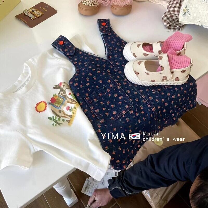 色:ホワイトショートスリーブTシャツ,ブルーフローラルサスペンダースカート