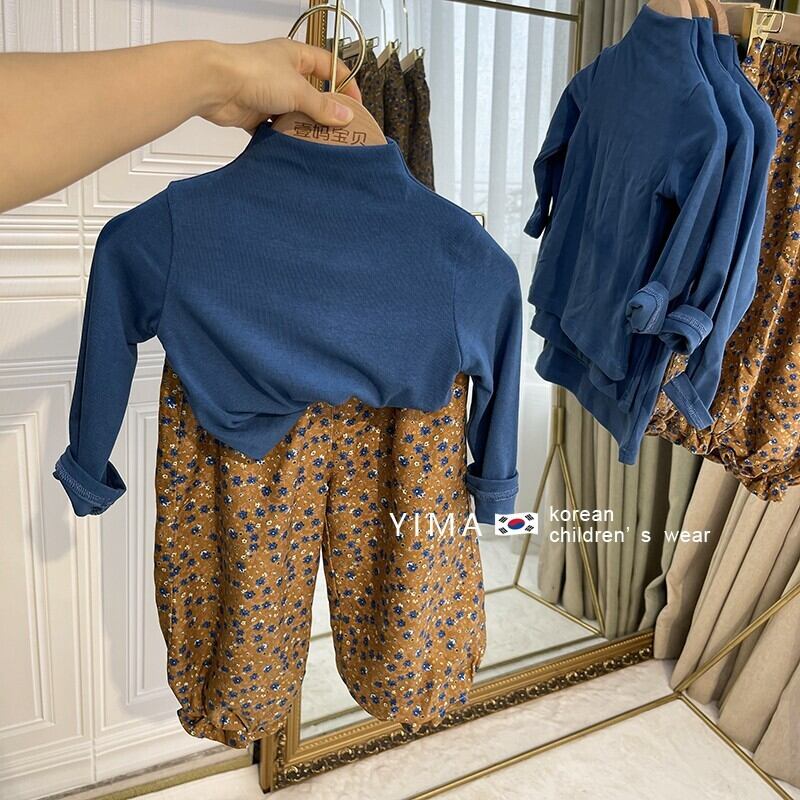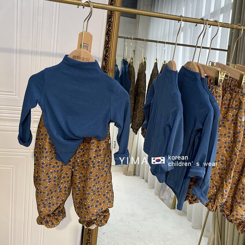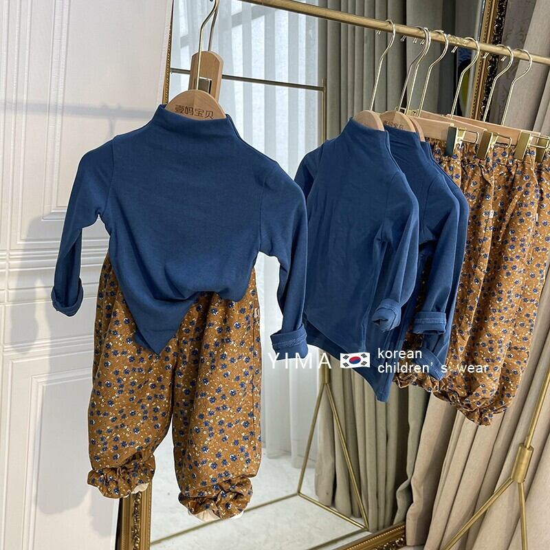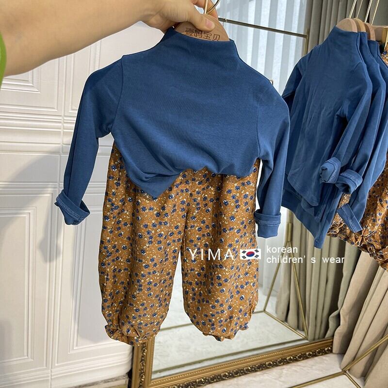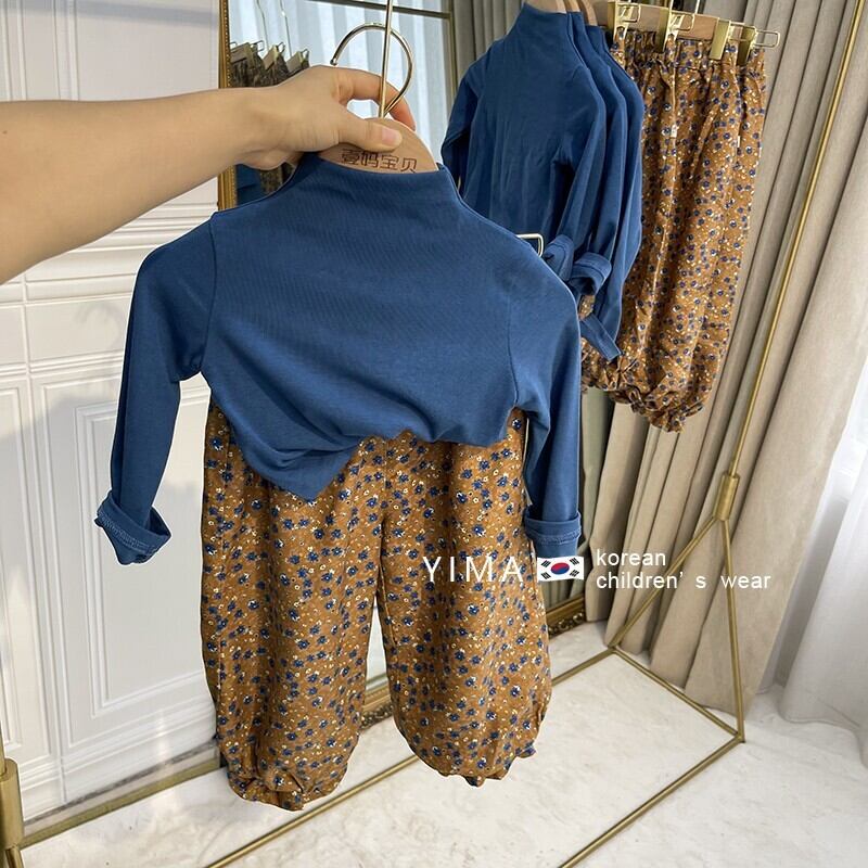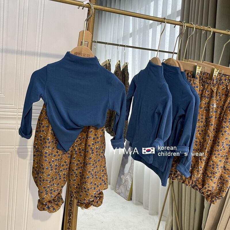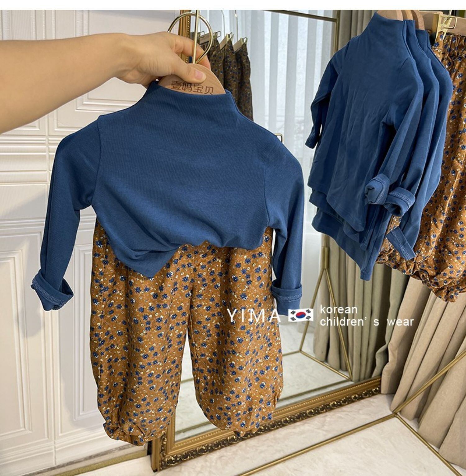 色:ダークブルーのボトムスシャツ,イエローフローラルパンツ