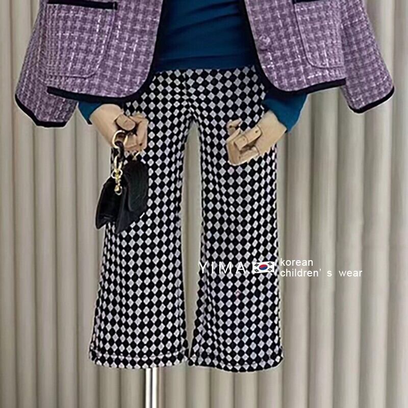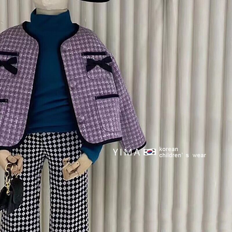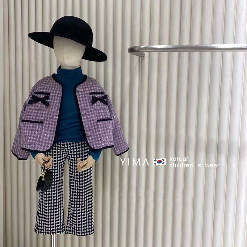 色:青いボトミングシャツ,紫のコート,チェック柄パンツ