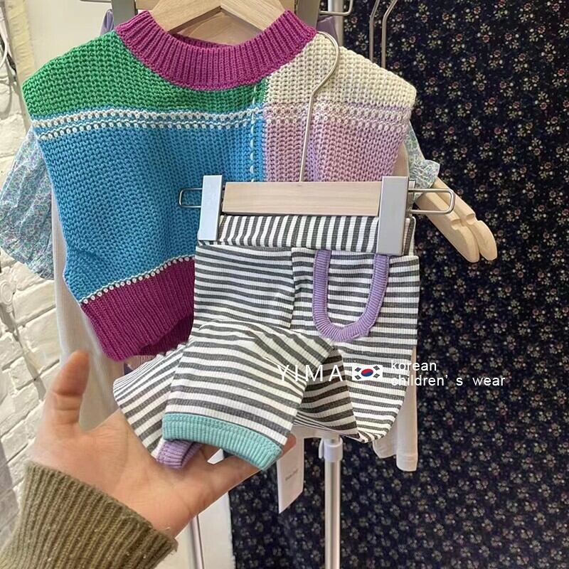 色:カラフルなベスト,ホワイトボトミングシャツ,ストライプパンツ