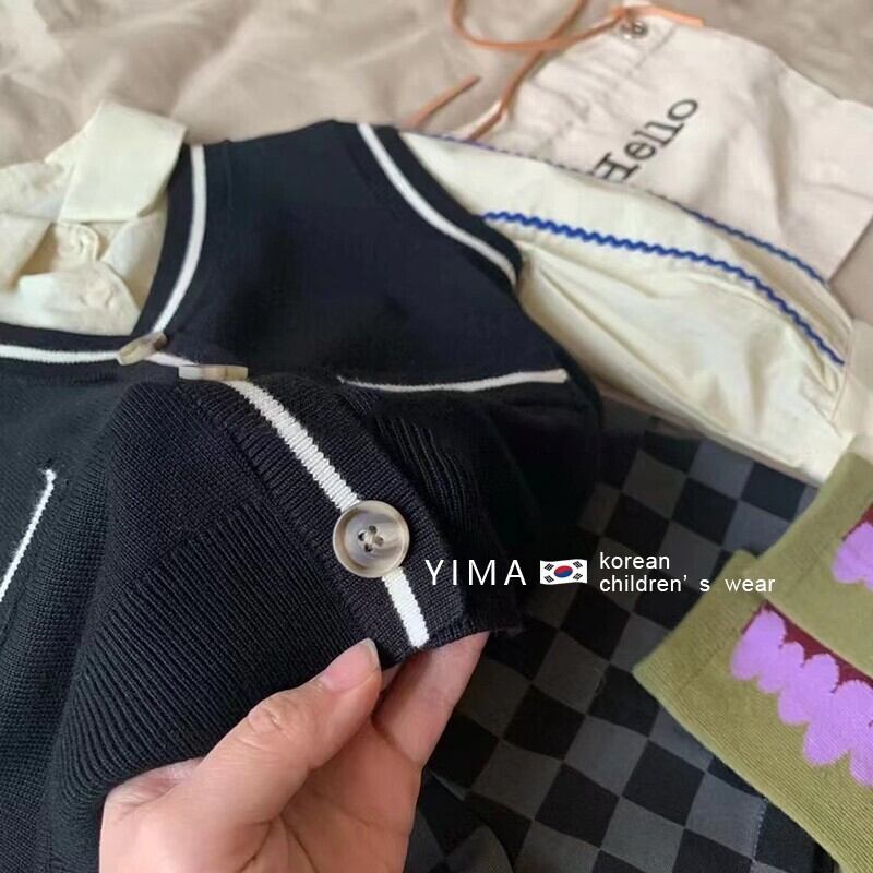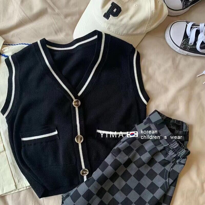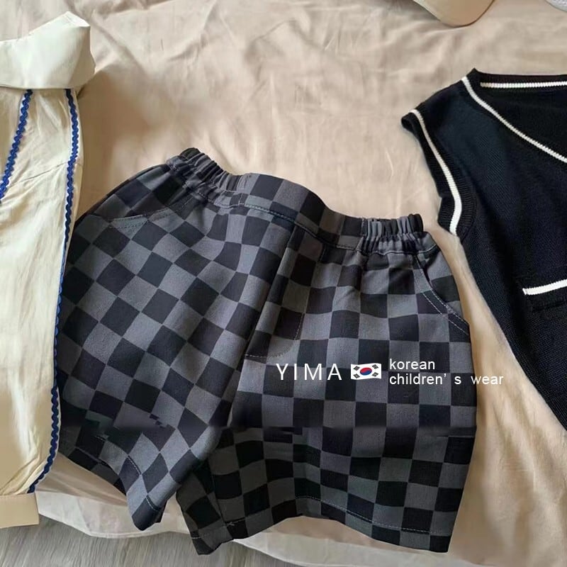 色:黒のニットベスト,ベージュのシャツ,ブラックチェック柄ショーツ