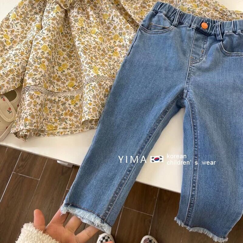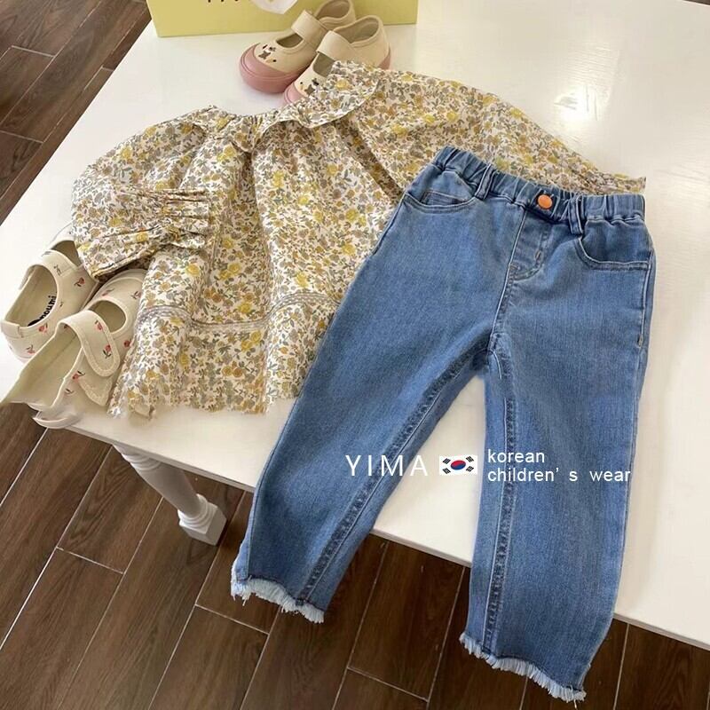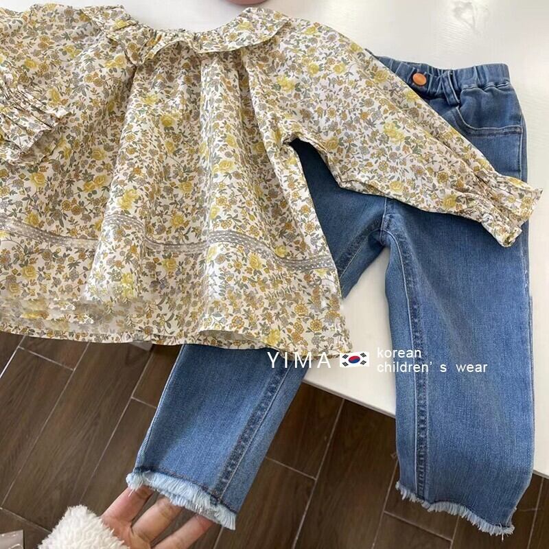 色:黄色い花柄のシャツ,ブルージーンズ
