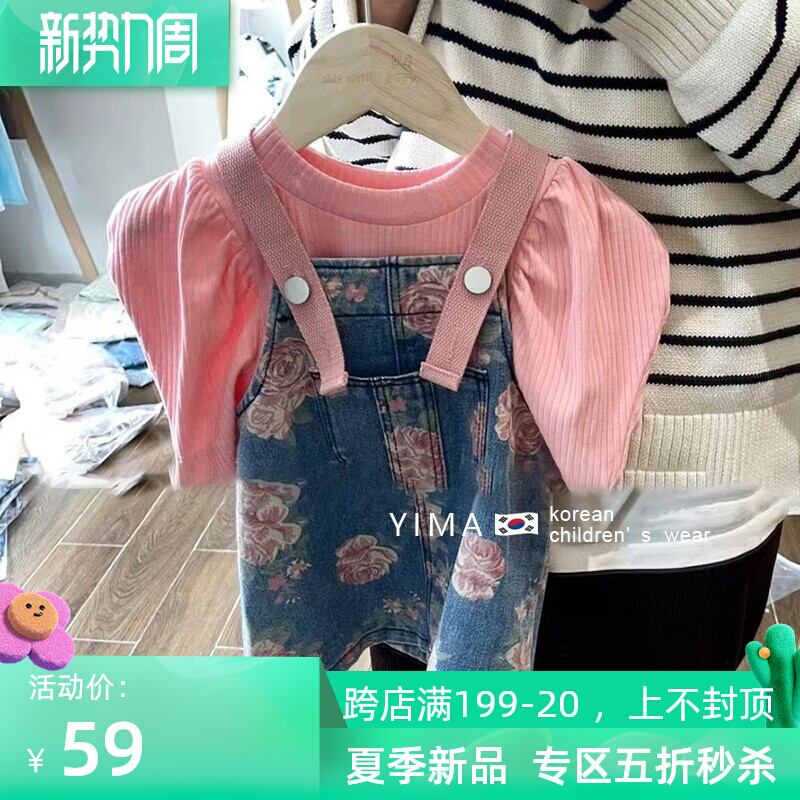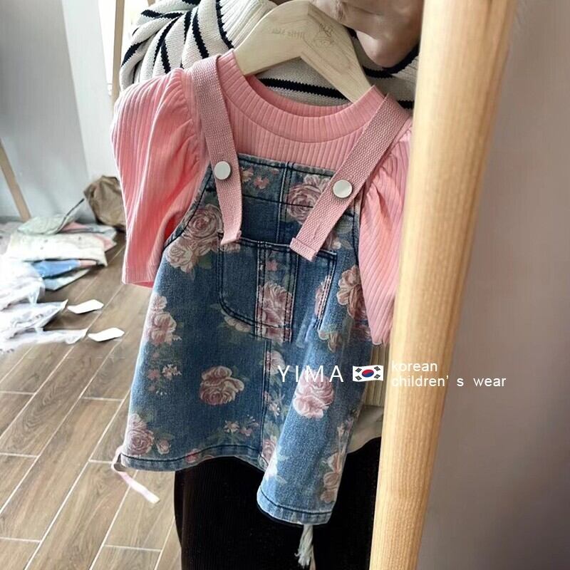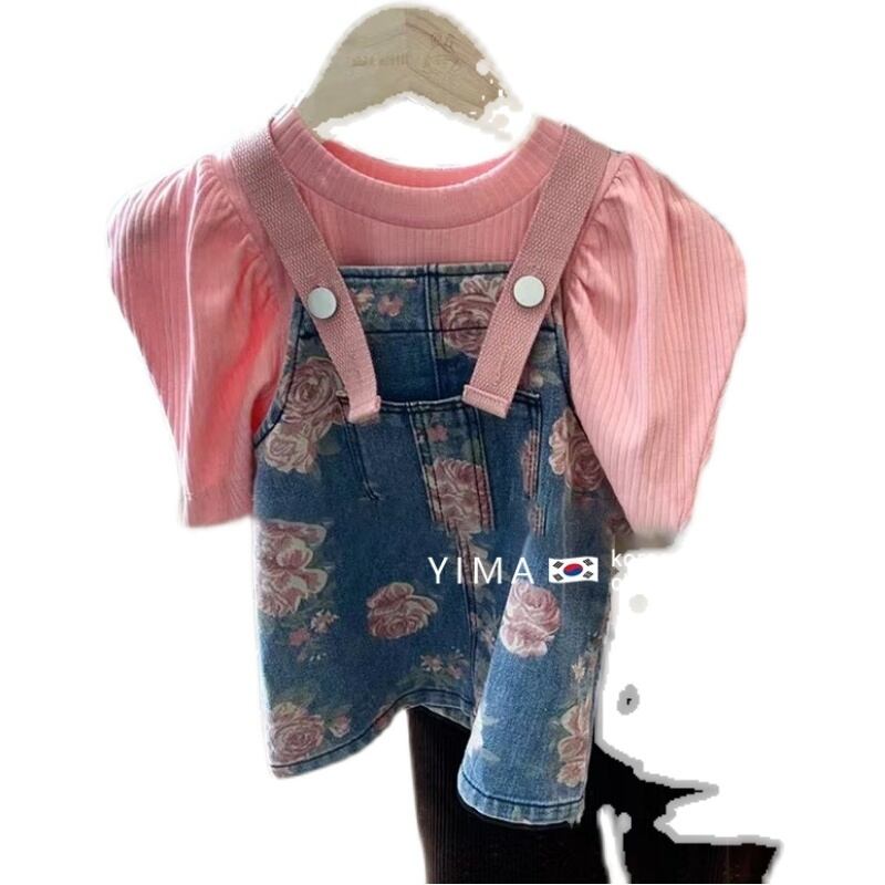 色:レトロ柄サスペンダースカート,ピンクの半袖シャツ