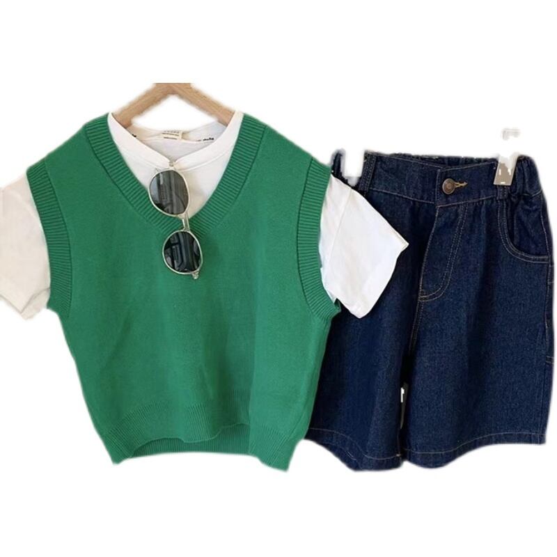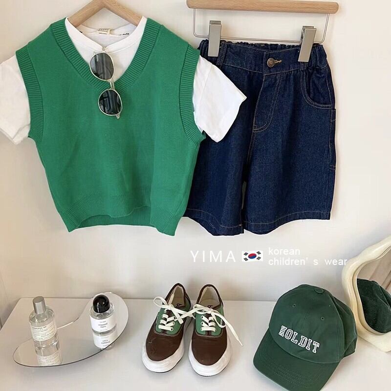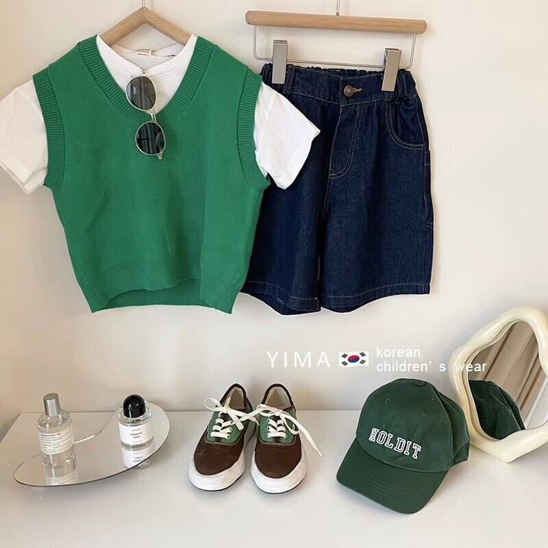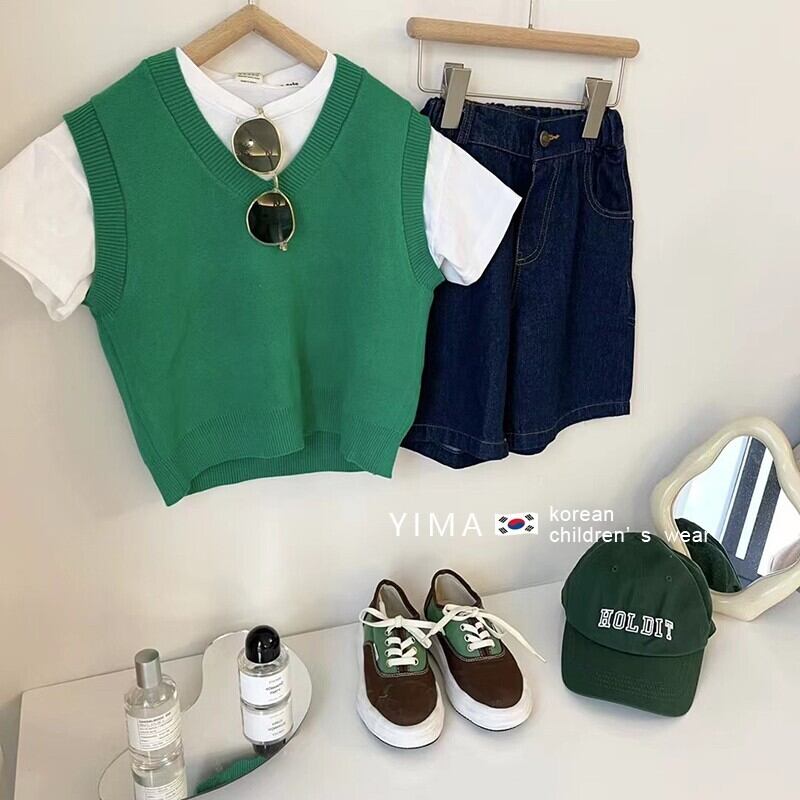 色:グリーンニットベスト,白い半袖,ブルーショートパンツ