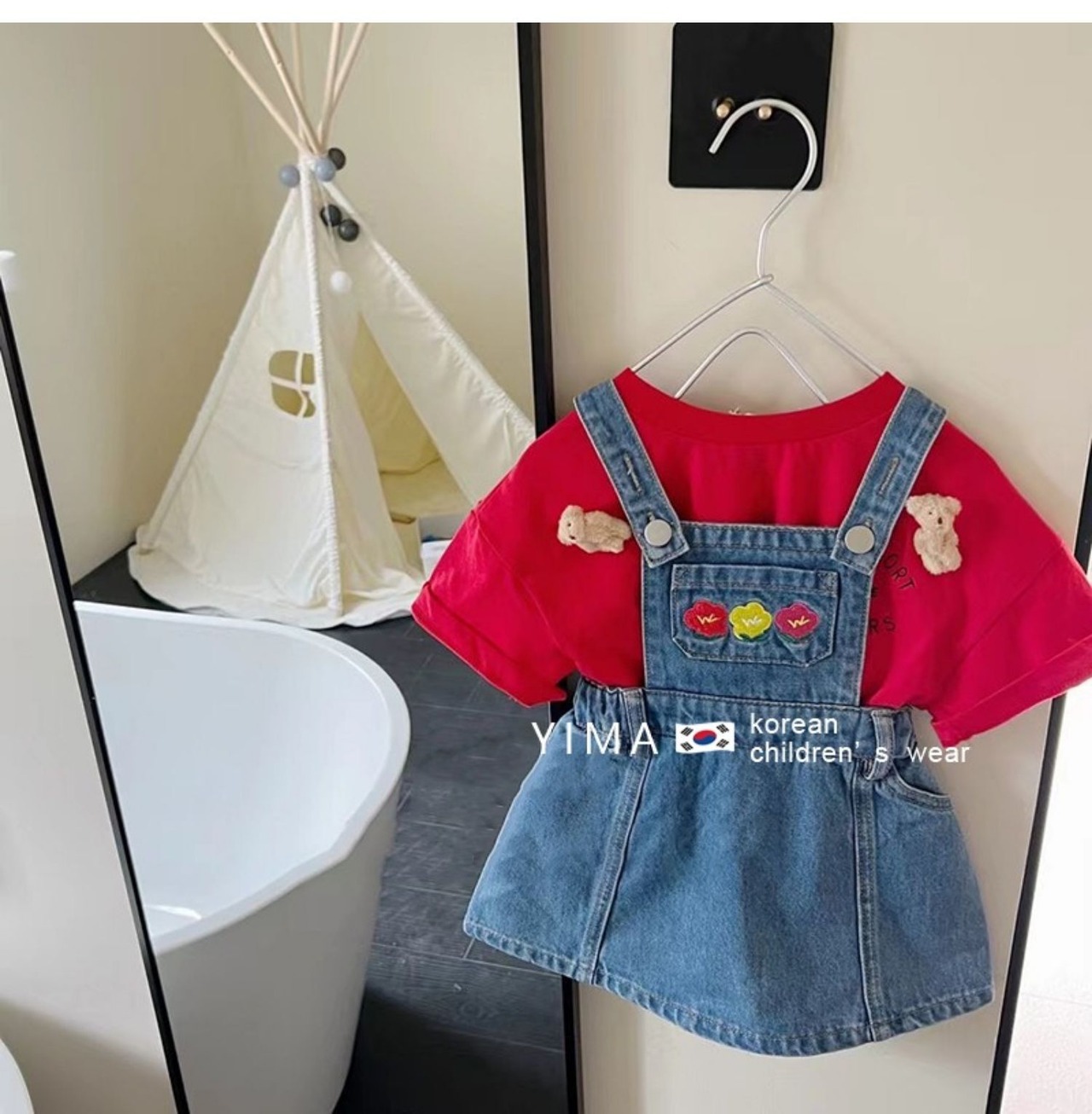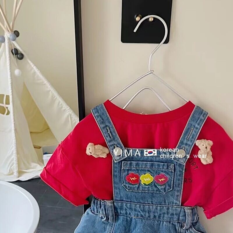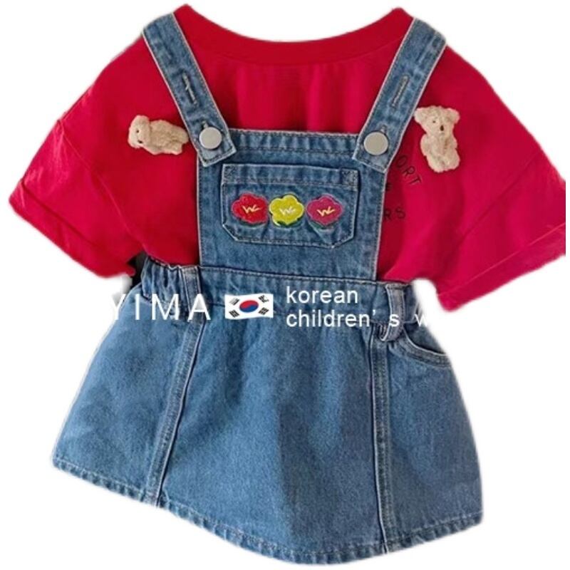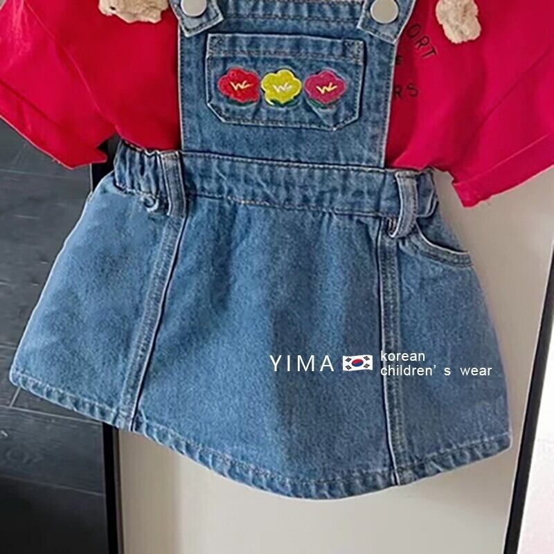 色:ブルーストラップスカート,赤い半袖