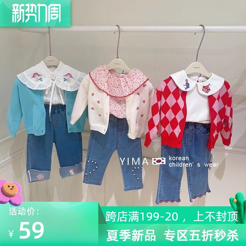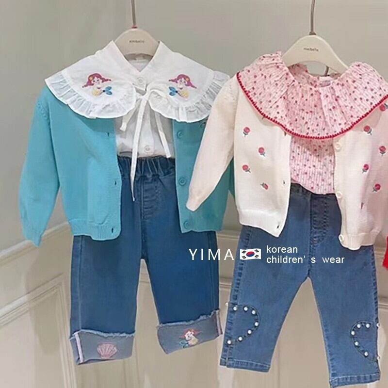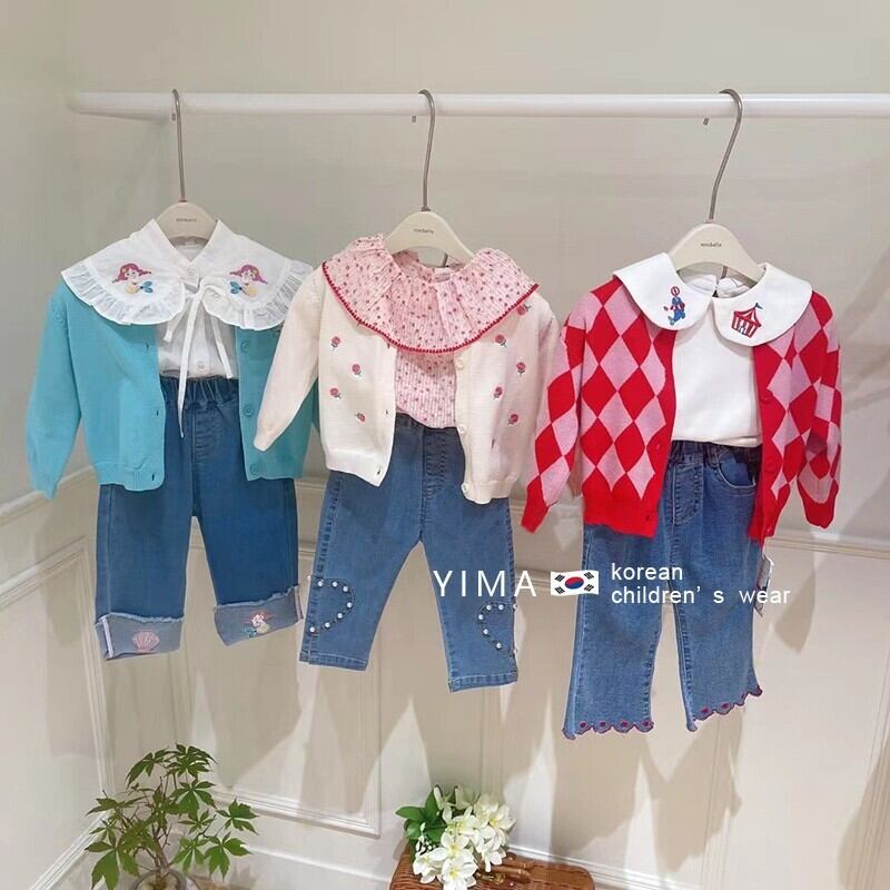 色:ブルーニットカーディガン,ホワイトニットカーディガン,赤いニットカーディガン,白のシャツ,ブルー刺繍ジーンズ