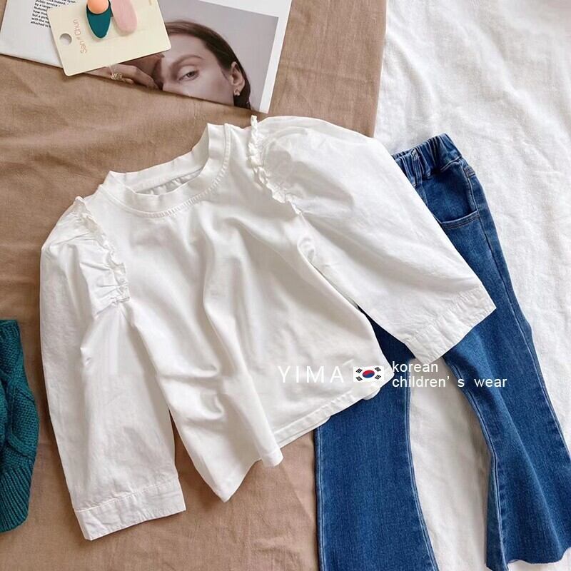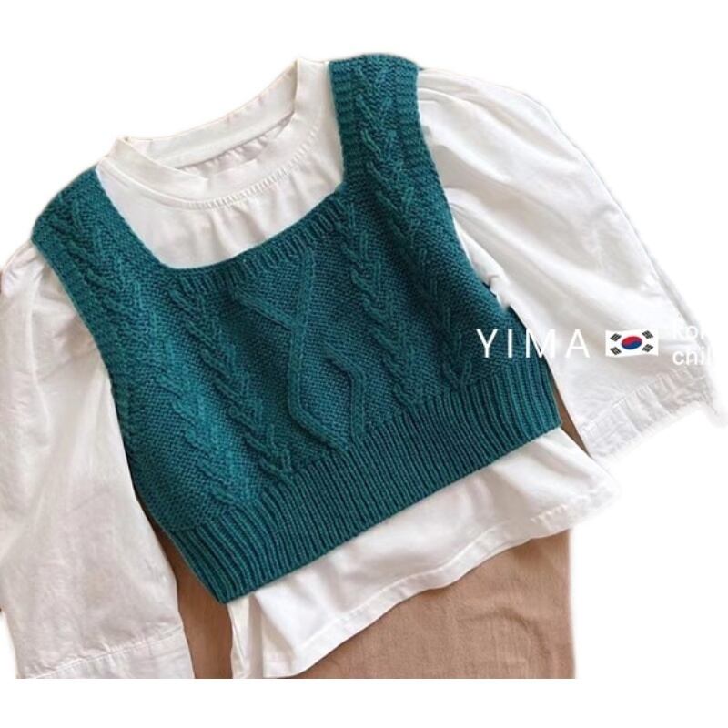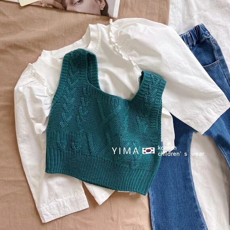 色:ブルーニットベスト,ホワイトトップ,ブルーデニムフレアパンツ
