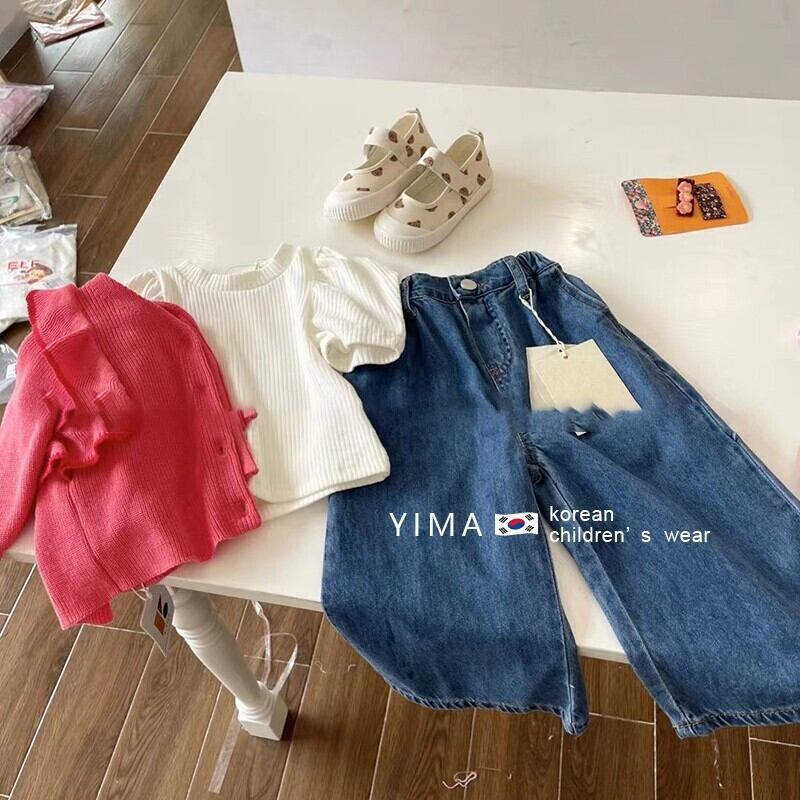 色:ブルージーンズ,白い半袖トップ,ピンクの菌類でトリミングされたセーター
