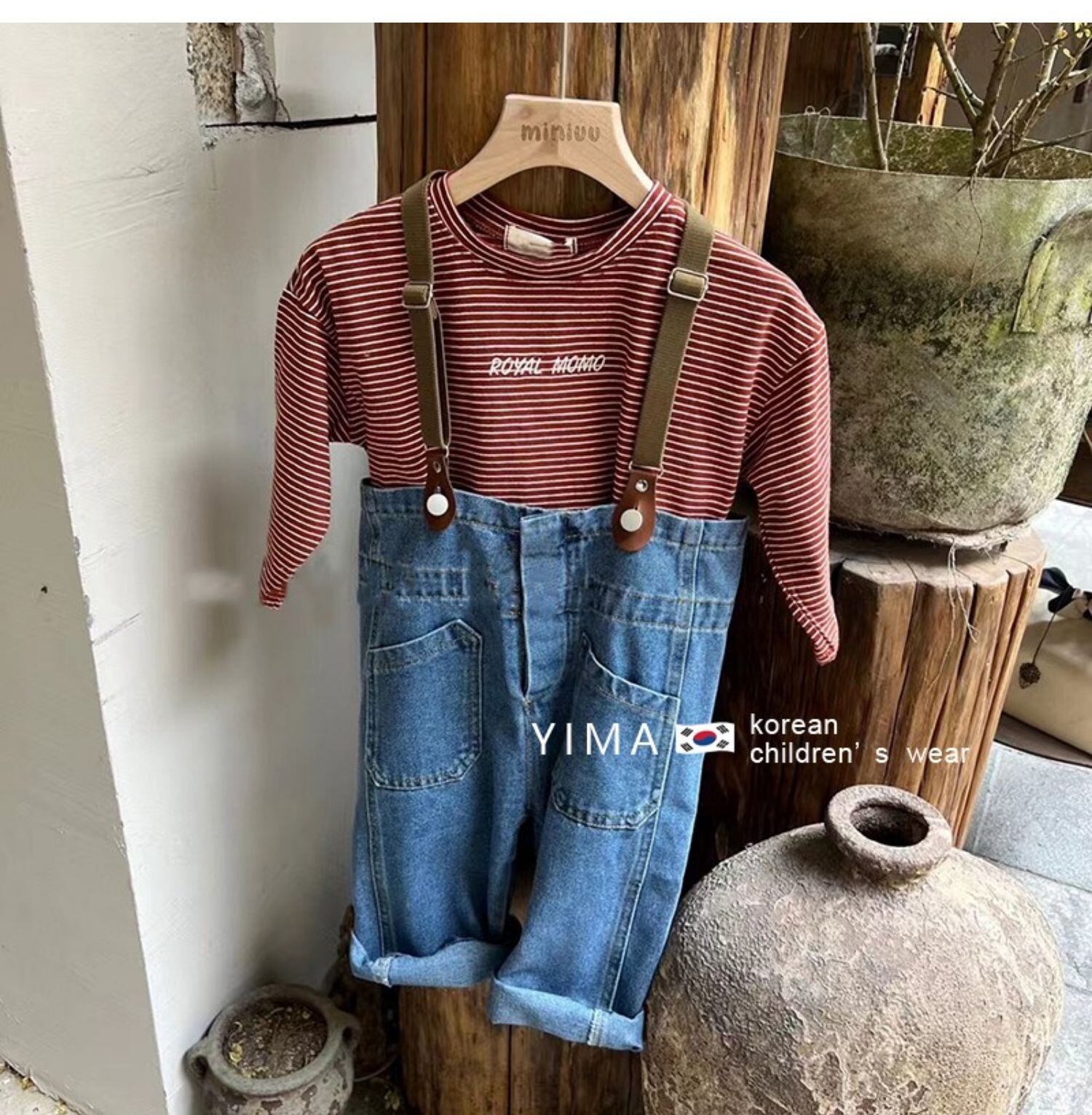 色:ブルージーンズ,茶色の赤い縞模様のシャツ