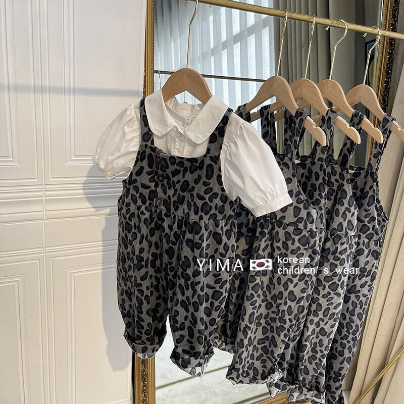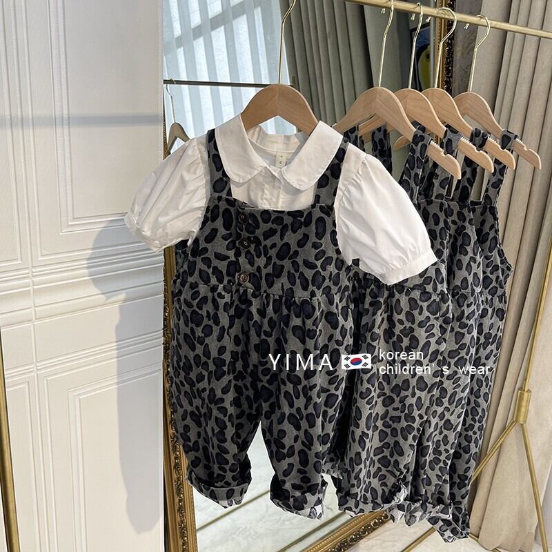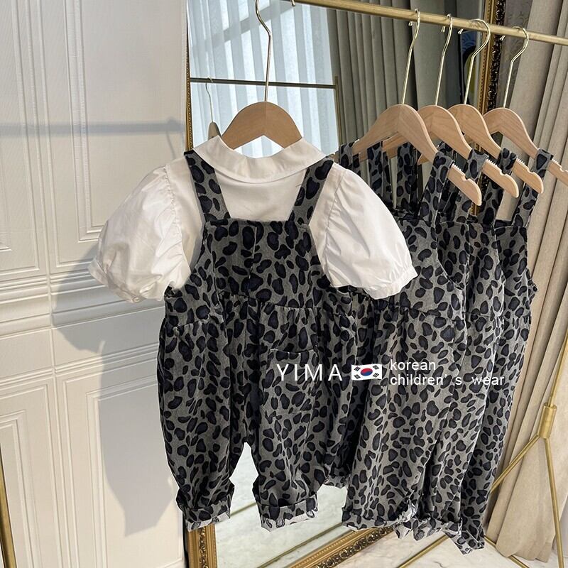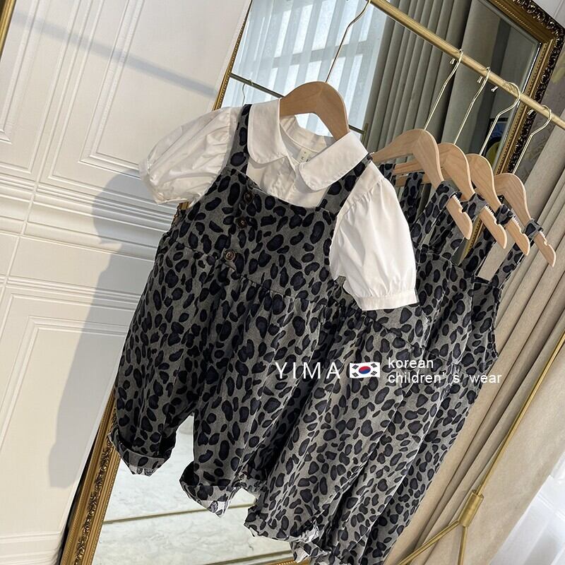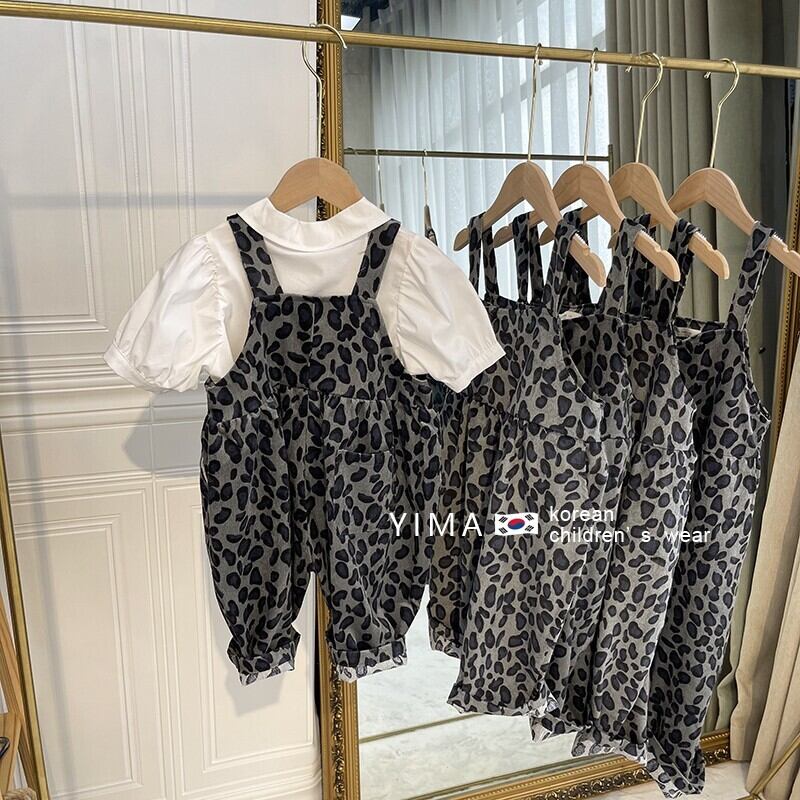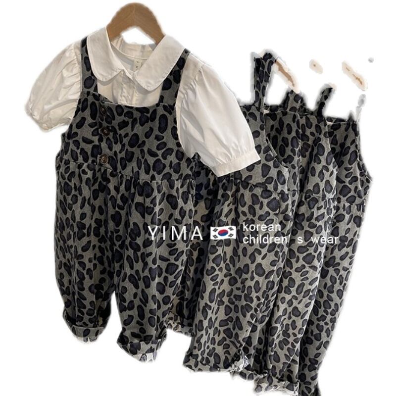 色:白のシャツ,ヒョウ柄のオーバーオール