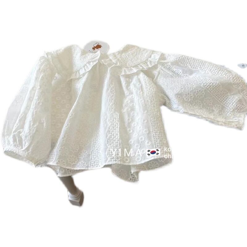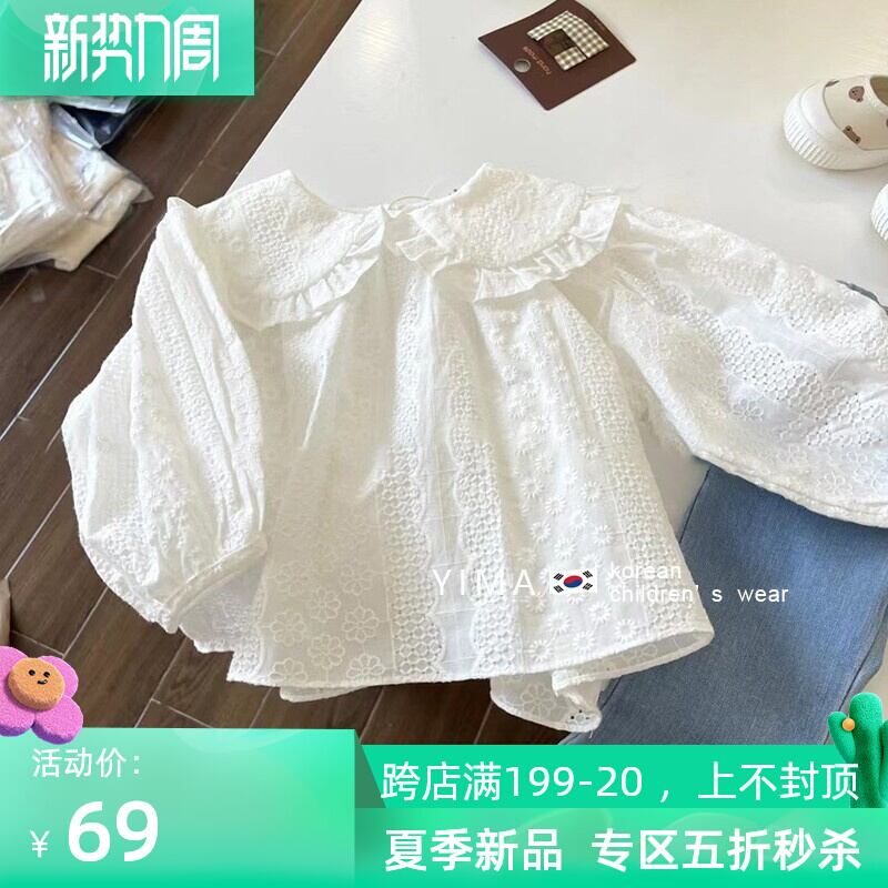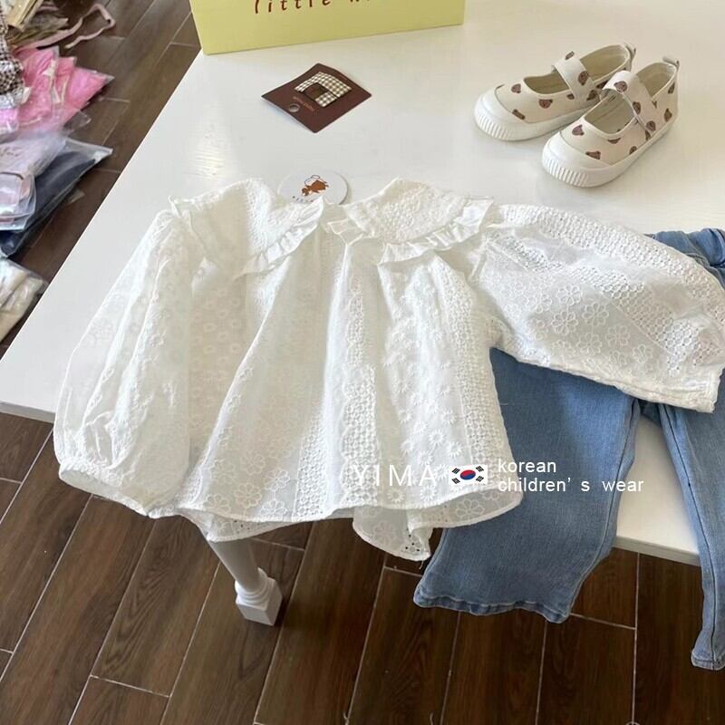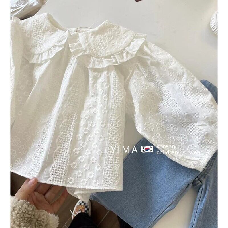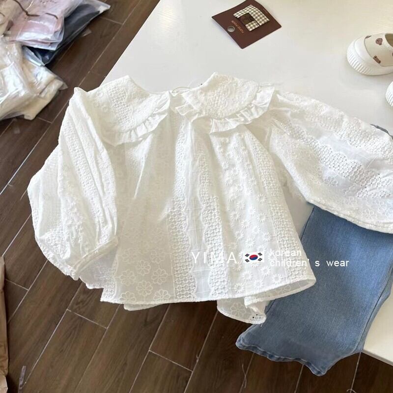 色:白長袖シャツ,ブルージーンズ,ブルーワイドレッグデニムパンツ