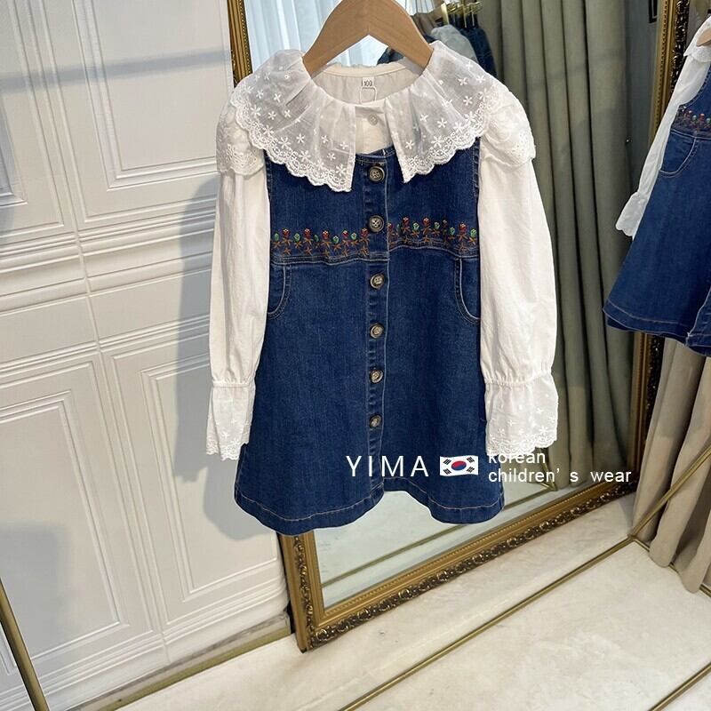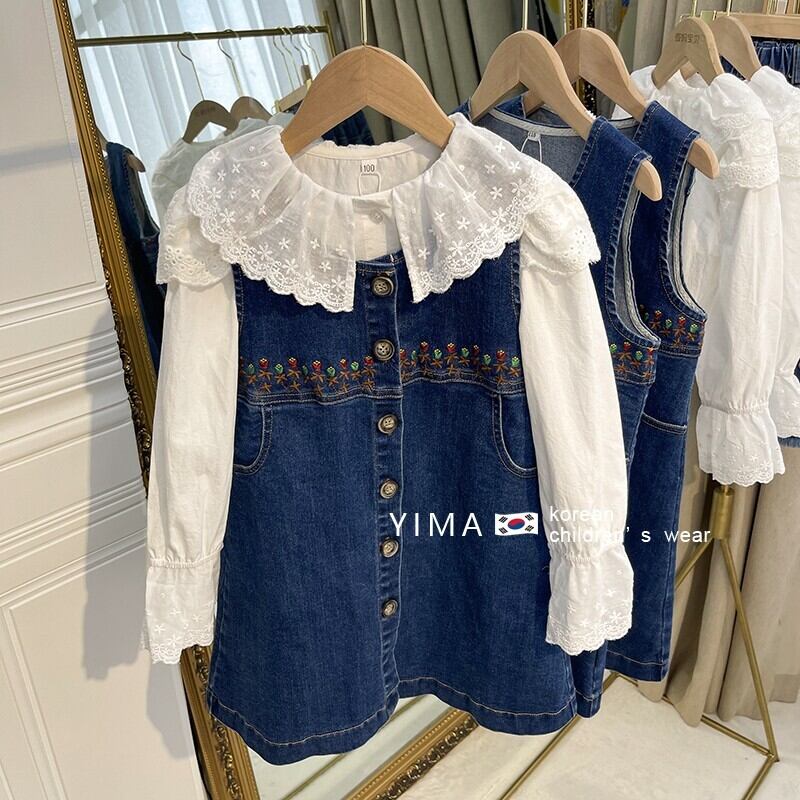 色:白のシャツ,デニムベストスカート