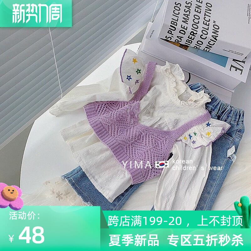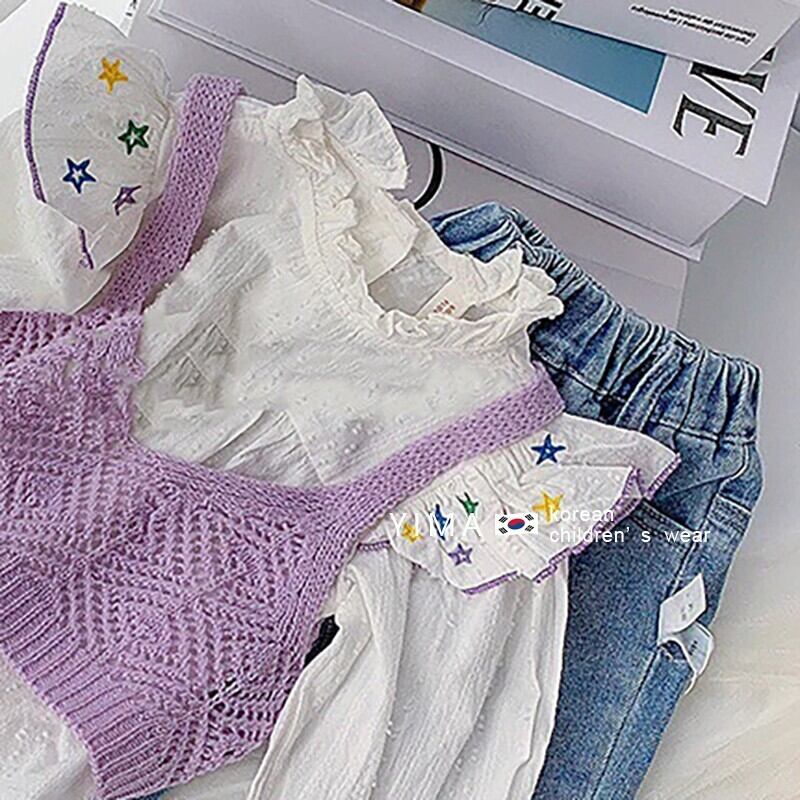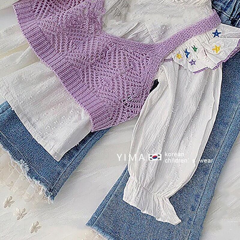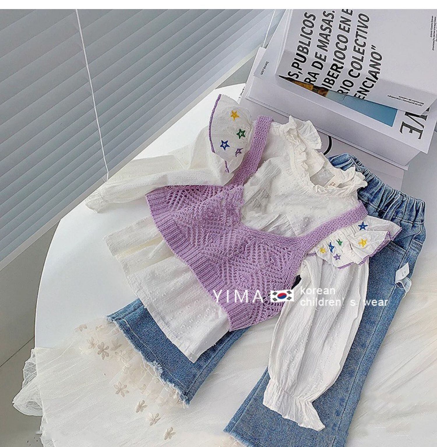 色:パープルベスト,ホワイトフライングスリーブシャツ,ブルージーンズ