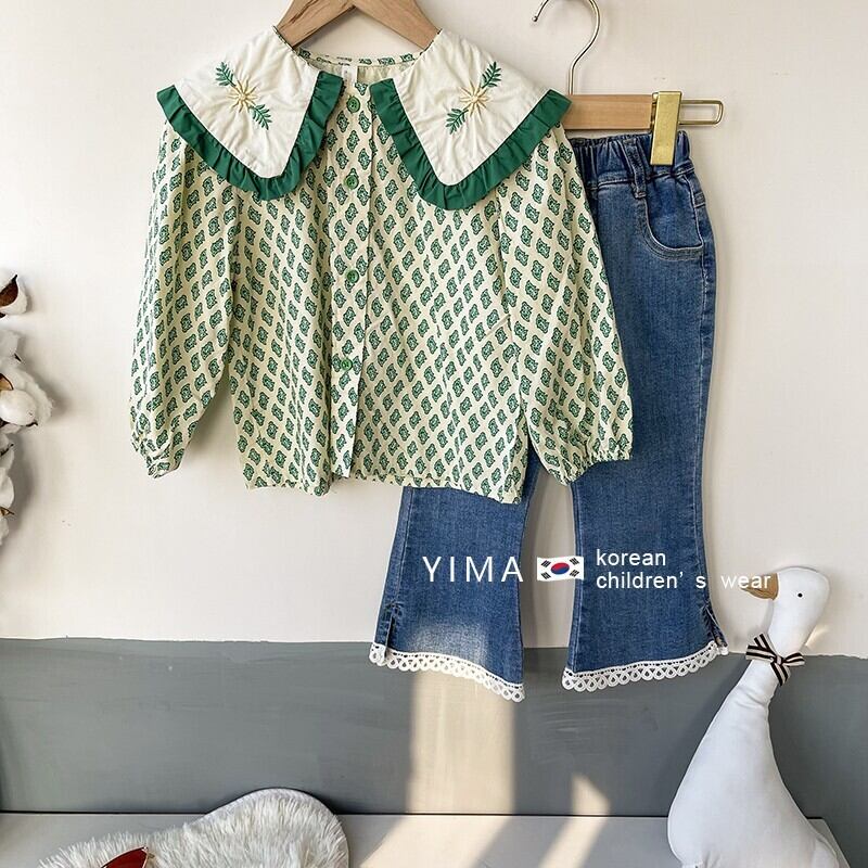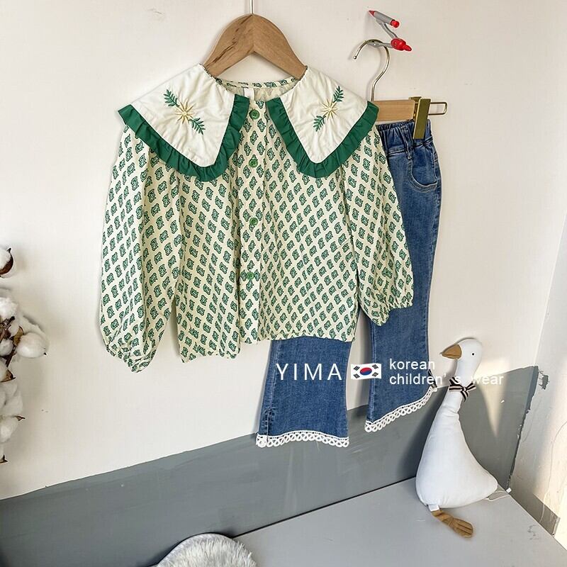 色:緑のシャツ,ブルージーンズ