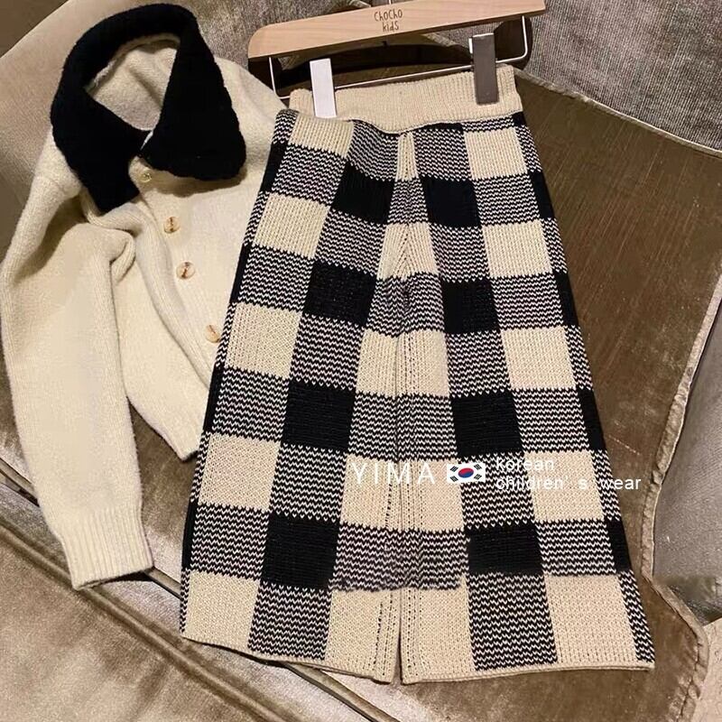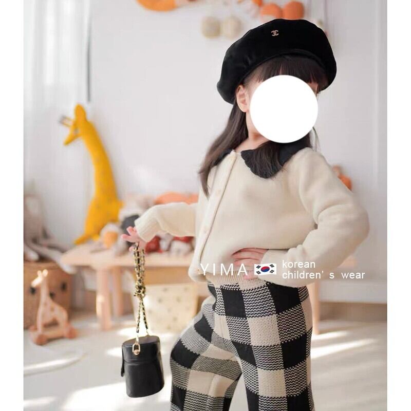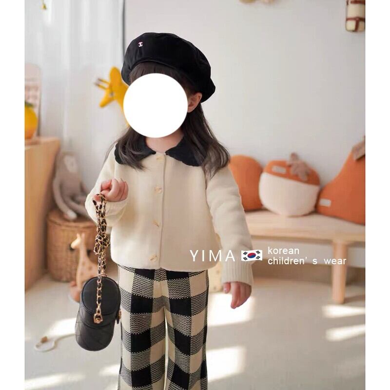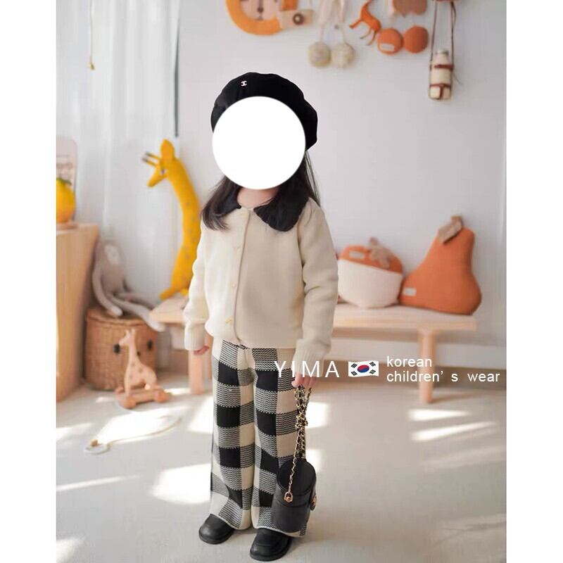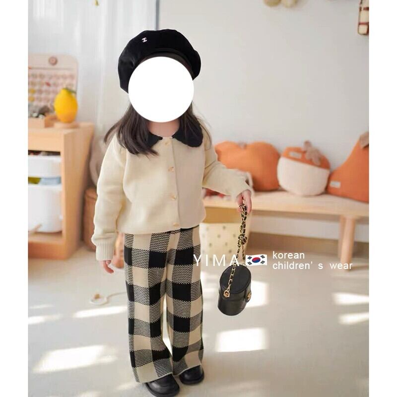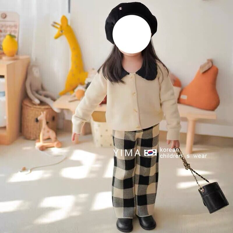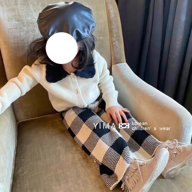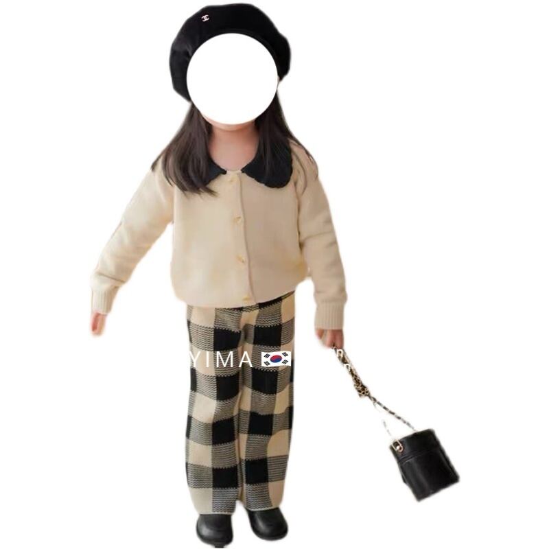 色:オフホワイトのセーターカーディガン,チェック柄ニットワイドレッグパンツ