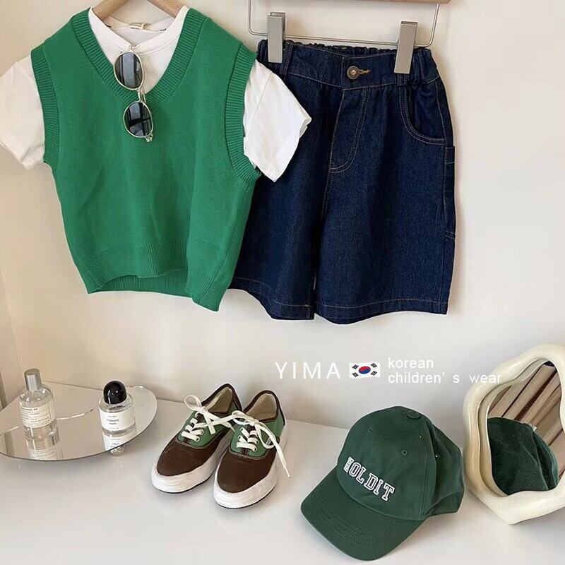 色:グリーンニットベスト,白い半袖,ダークブルーのショートパンツ