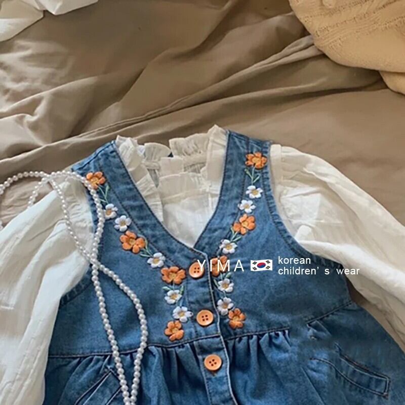 色:ブルーストラップスカート,白のシャツ