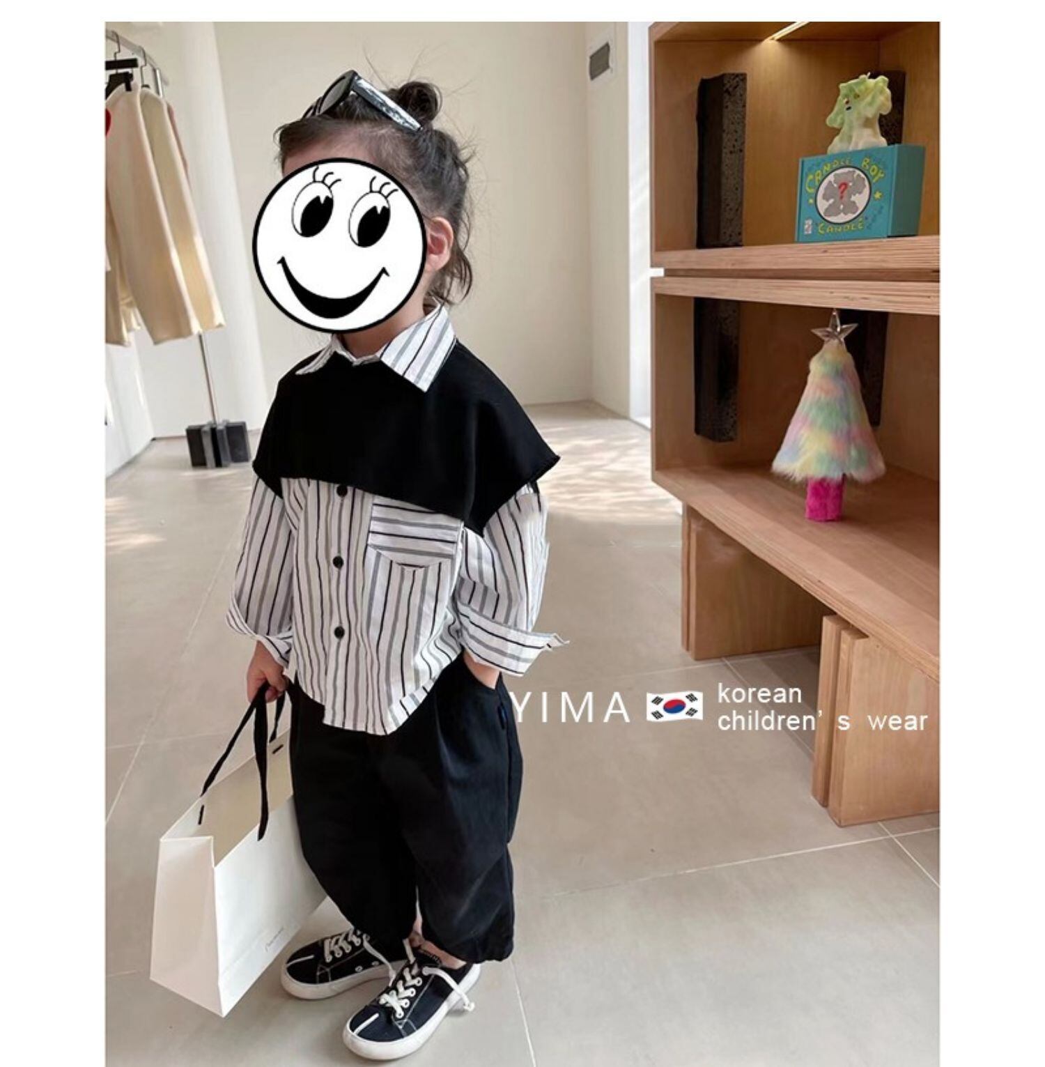 色:縦柄シャツ,黒いズボン