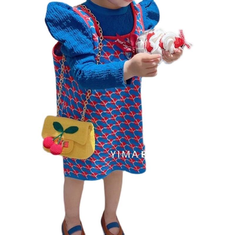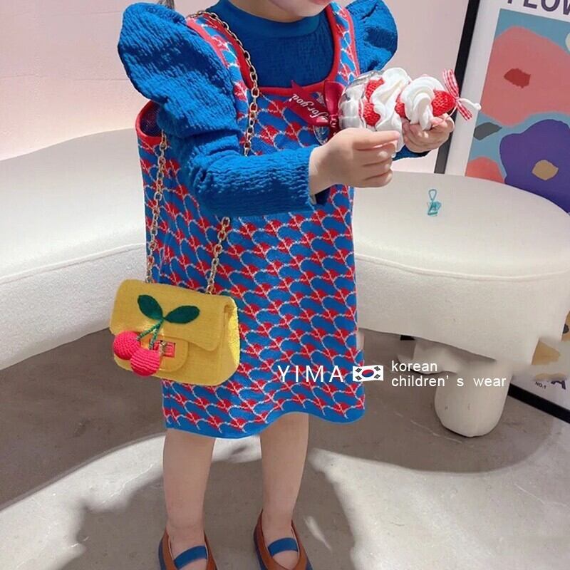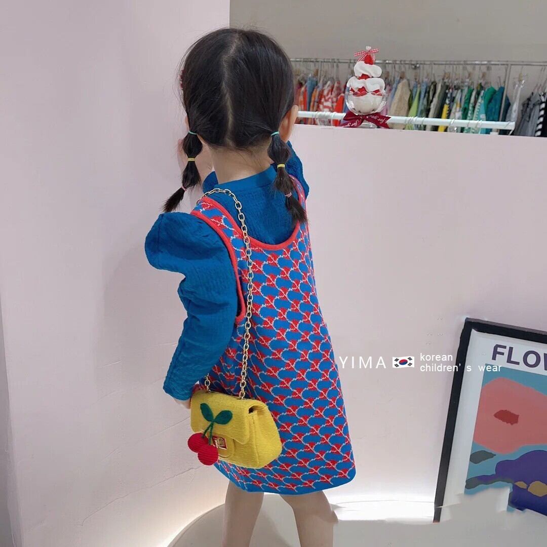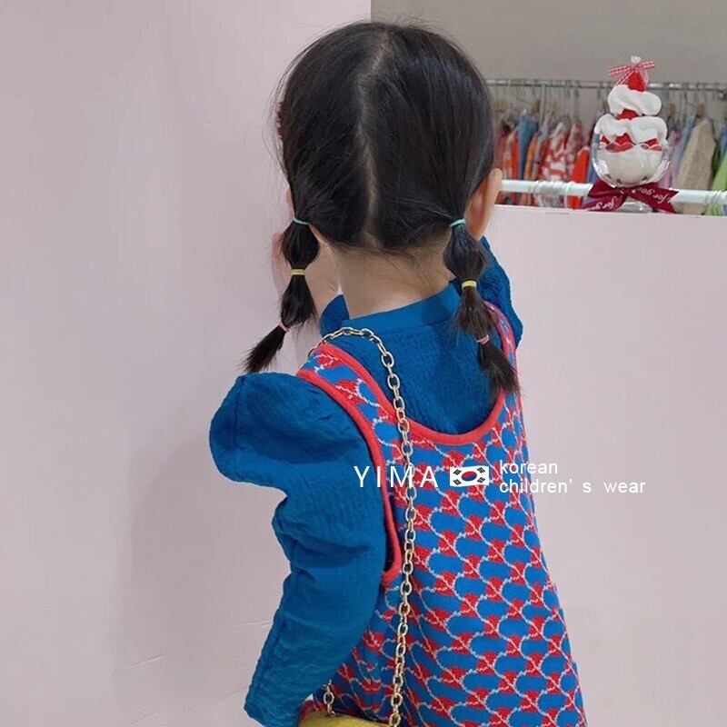 色:赤い格子縞のドレス,ブルーパフスリーブトップ