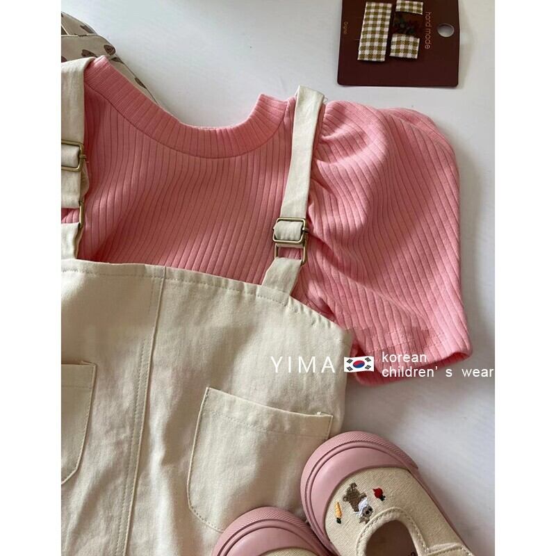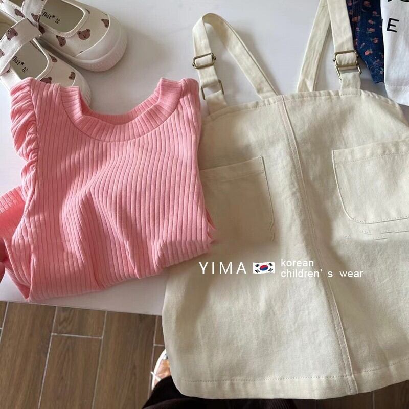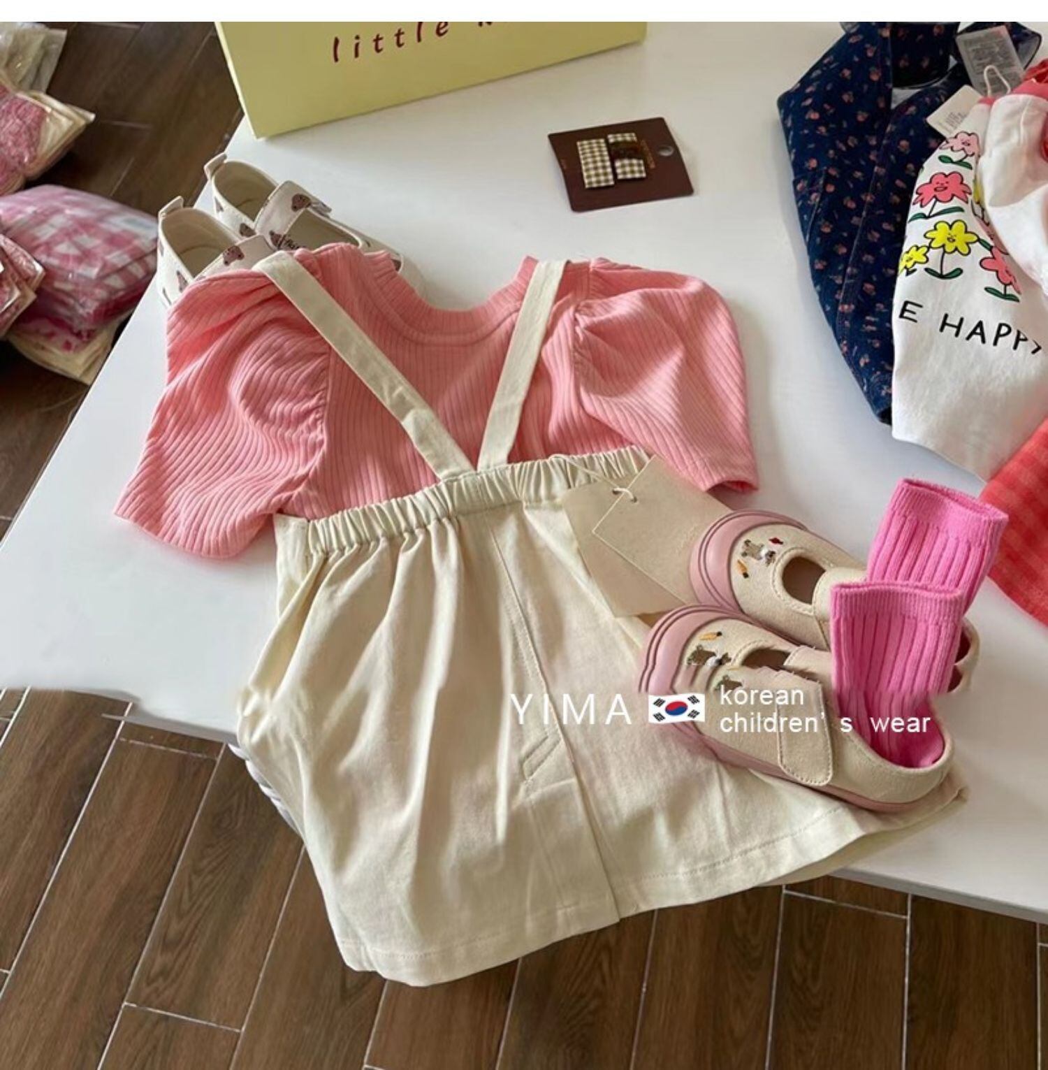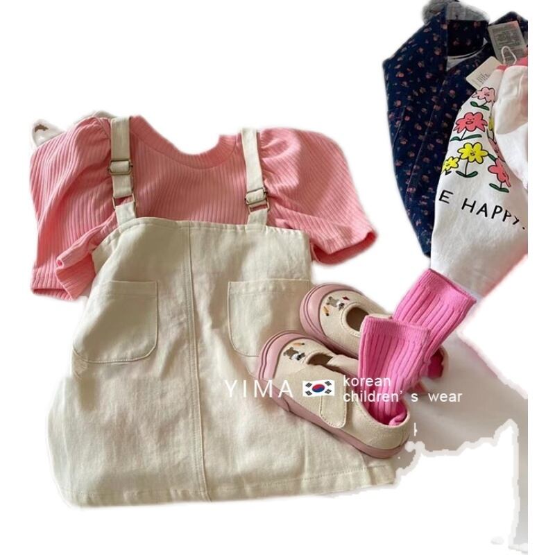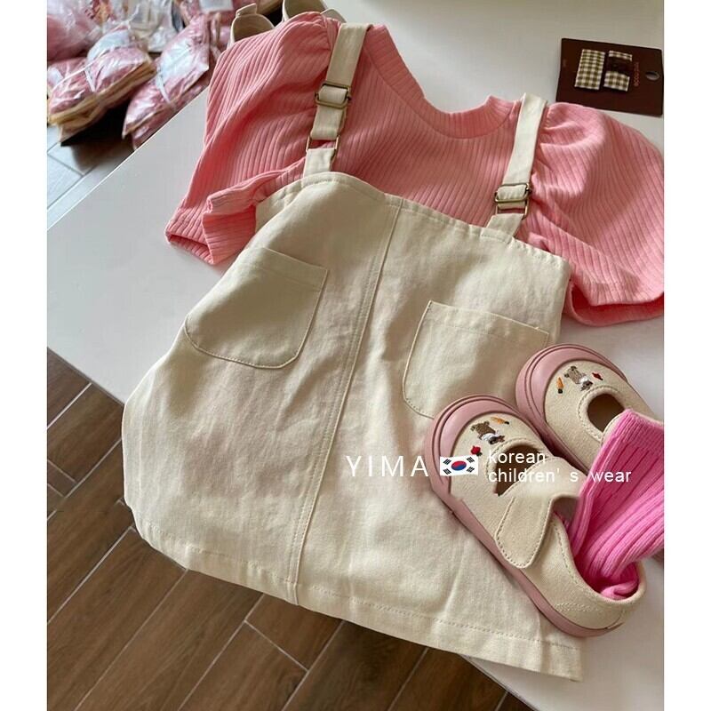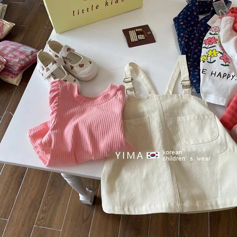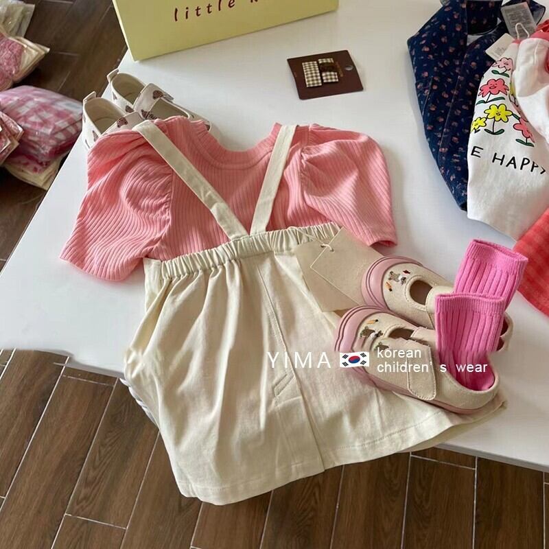 色:オフホワイトストラップスカート,コーラルピンクの半袖シャツ