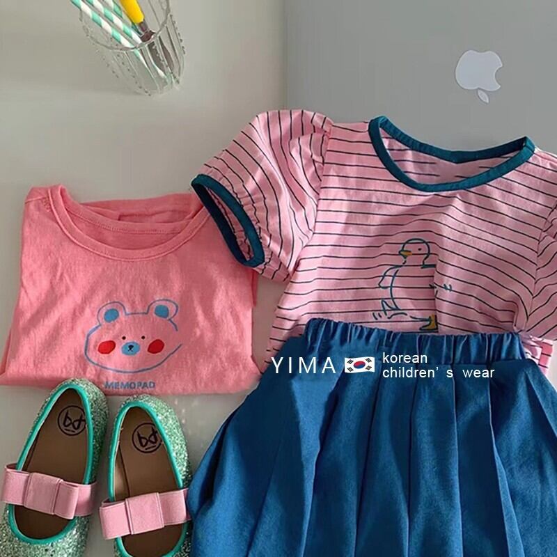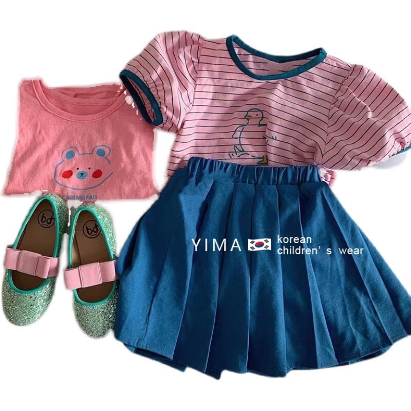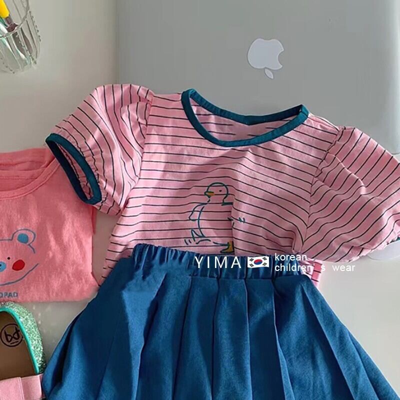 色:ストライプトップ,ピンクトップ,青いスカート