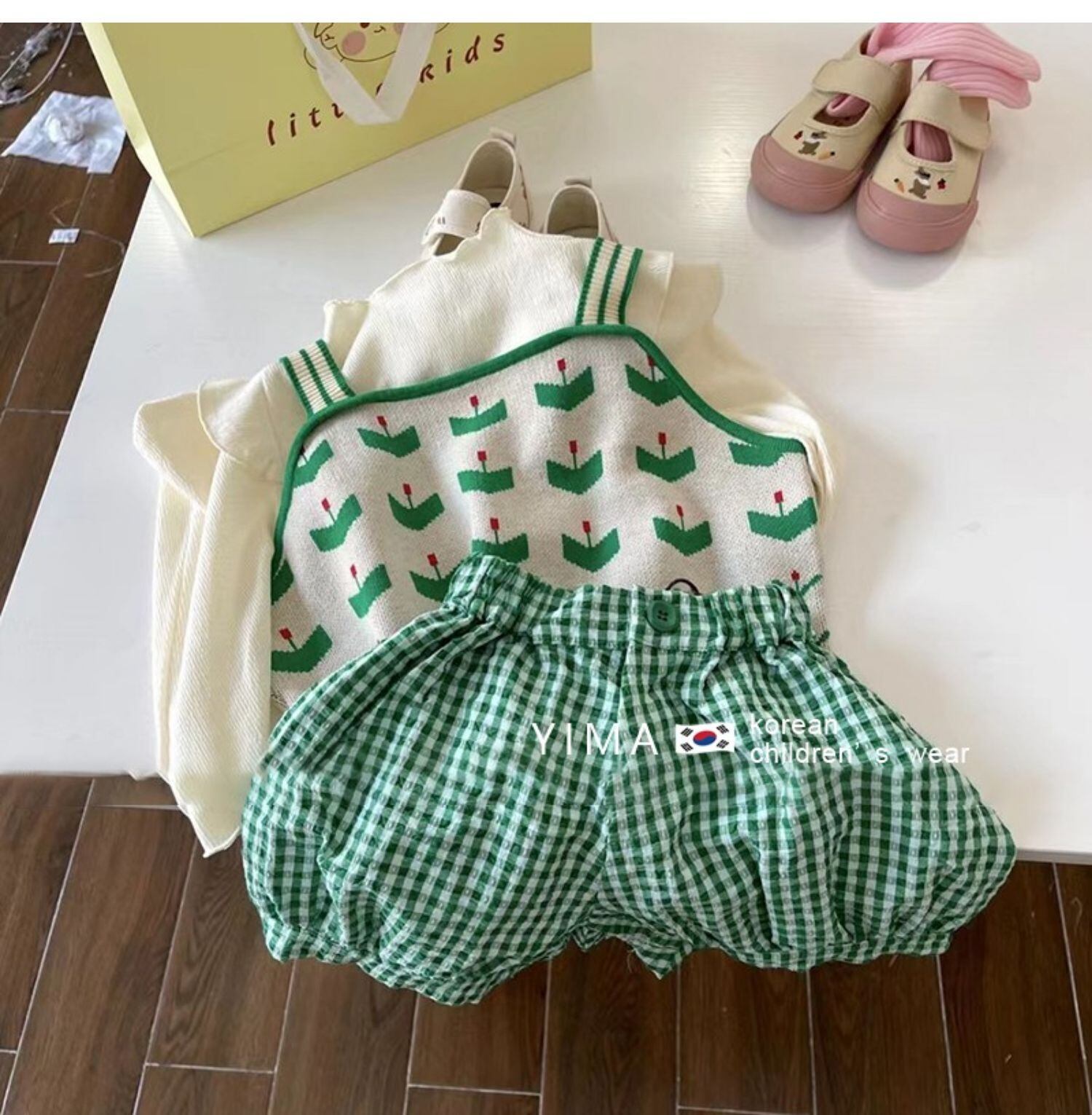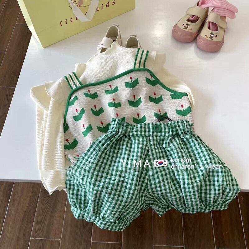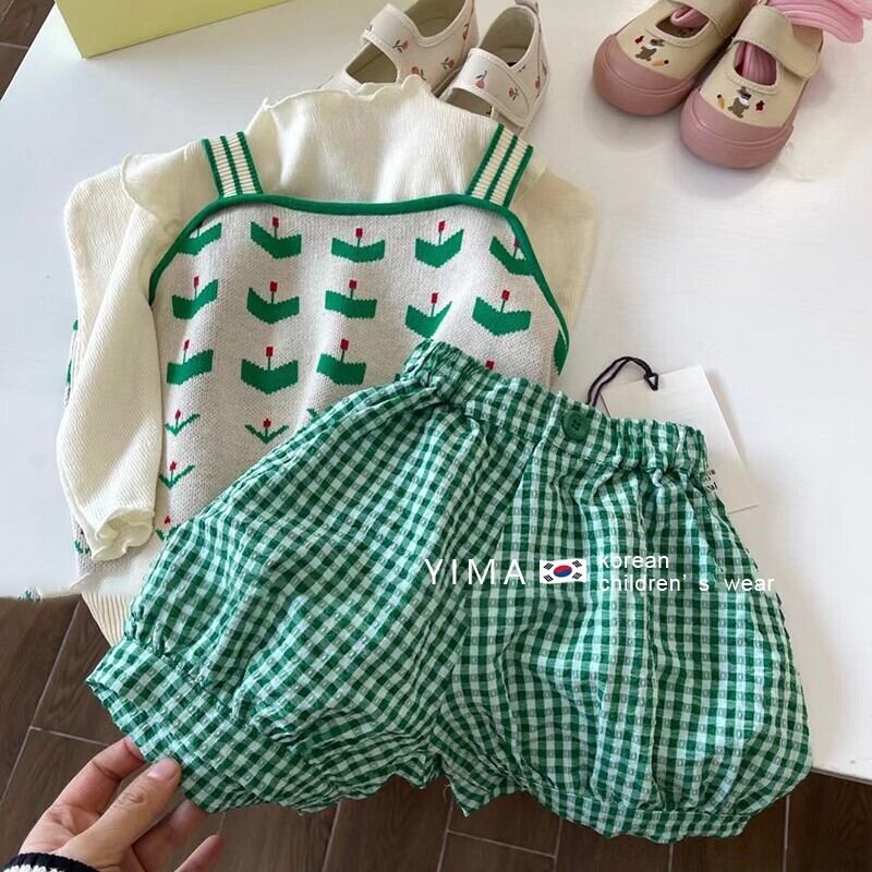 色:緑のチェック柄ショーツ,ベージュニットタンクトップ,ベージュトップ