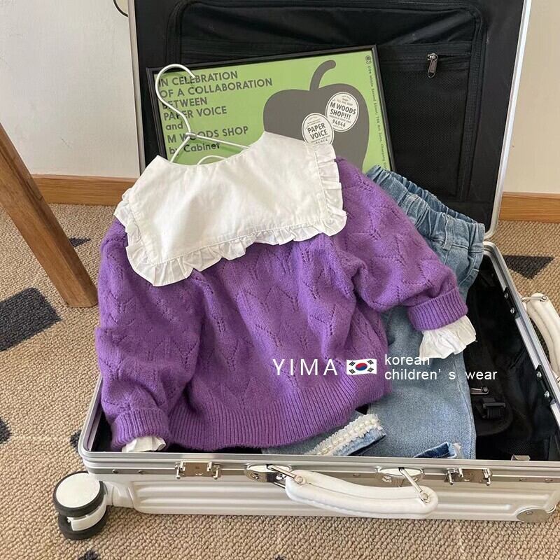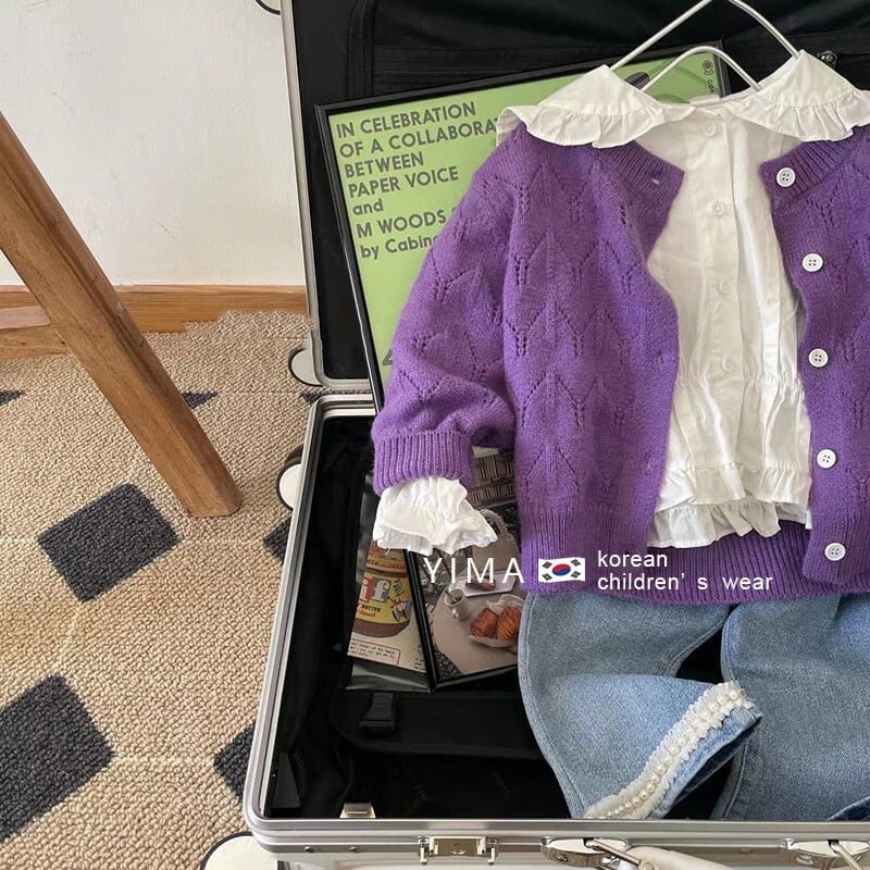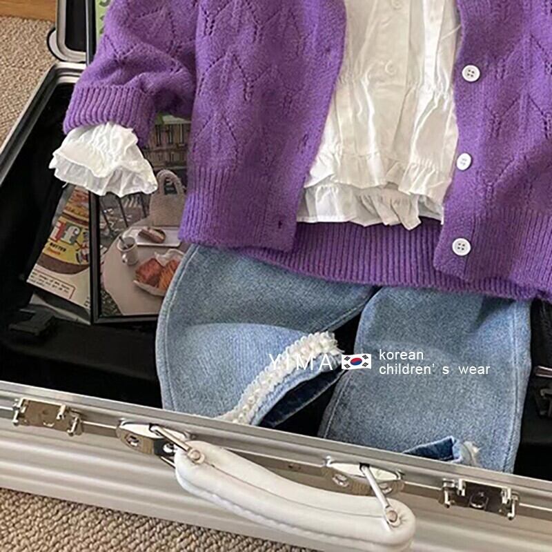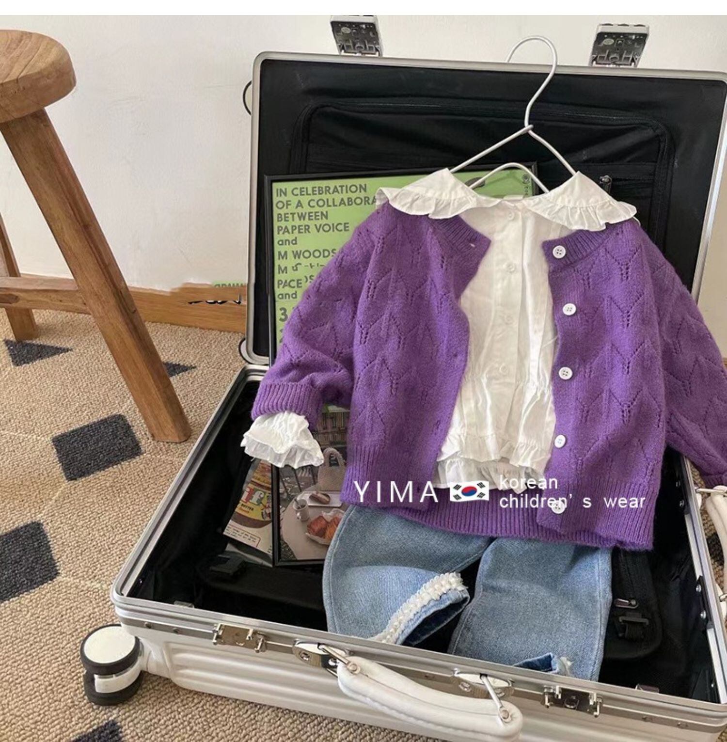 色:パープルニットカーディガン,白長袖シャツ,ブルージーンズ