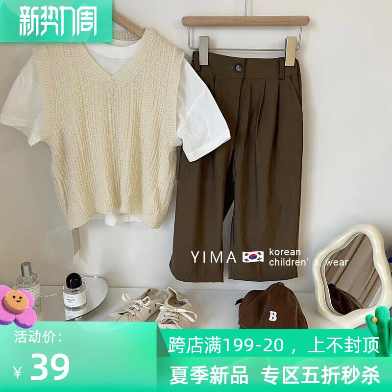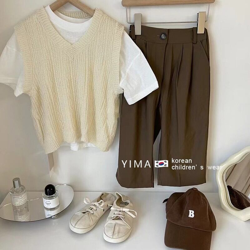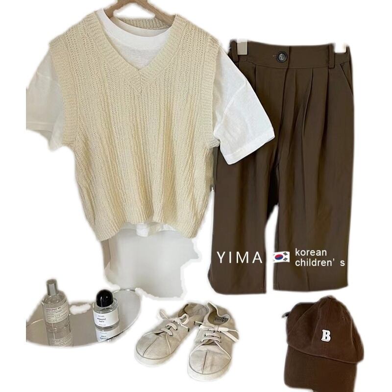 色:アプリコットニットベスト,白い半袖,Ceeカラーパンツ